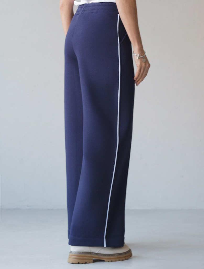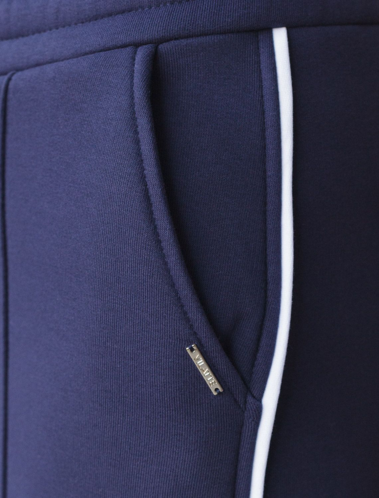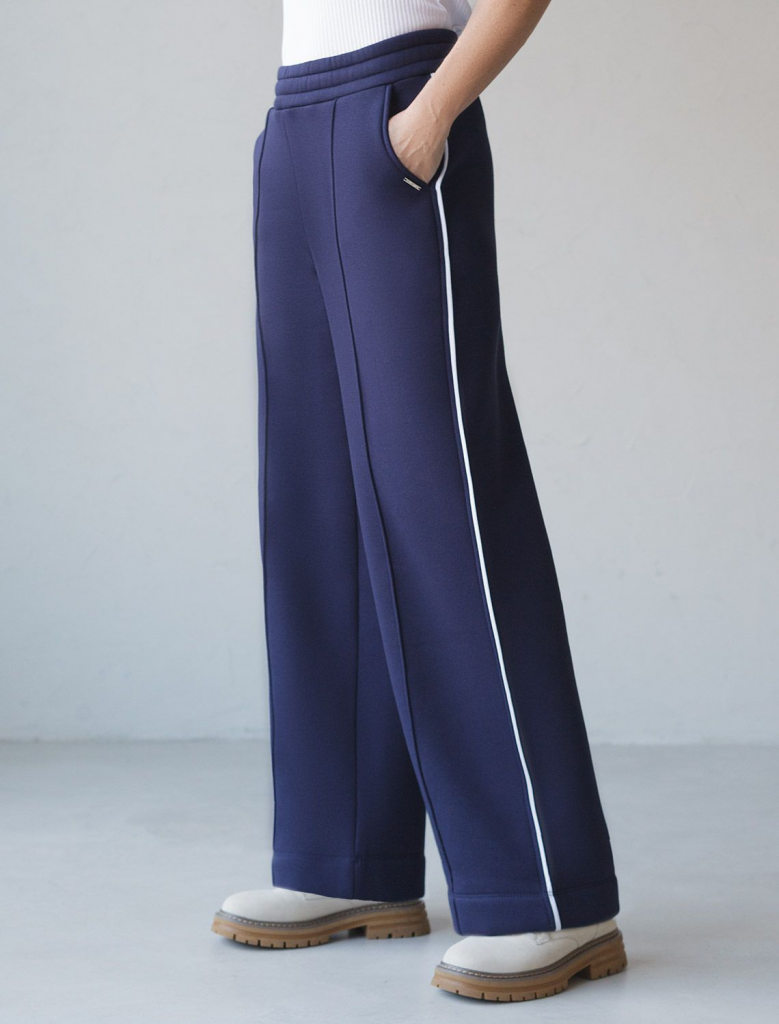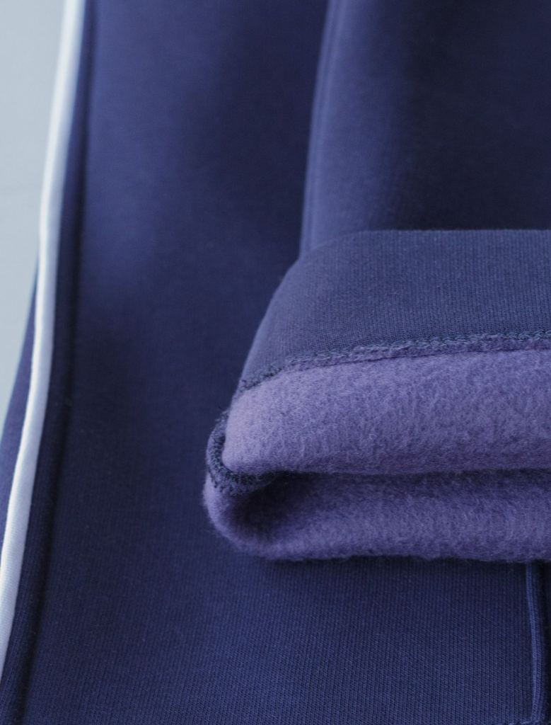 Теплые прямые брюки темно-синего цвета из эластичного футера трехнитки с начесом созданы для максимального комфорта в холодную погоду. Мягкий материал приятный к телу, хорошо держит форму, не вытягивается и не теряет форму даже при активной носке. Благодаря дышащим свойствам премиального футера, брюки подходят на любую погоду, обеспечивая оптимальный микроклимат и уют. Свободный крой и эластичный широкий пояс делает посадку удобной для разных типов фигуры и размеров, включая большие и маленькие. Застроченные стрелки визуально вытягиват силуэт и подчеркивают эстетичнось повседневных брюк, а контрастные тонкие лампасы добавляют актуальности образу. Благодаря особенностям трехниточного плетения и внутреннему слою с начесом, эти брюки отлично сохраняют тепло в холодные осенние и зимние дни, при этом в них вы будете выглядеть модно и современно. Сочетайте в комплекте с худи D49.142.