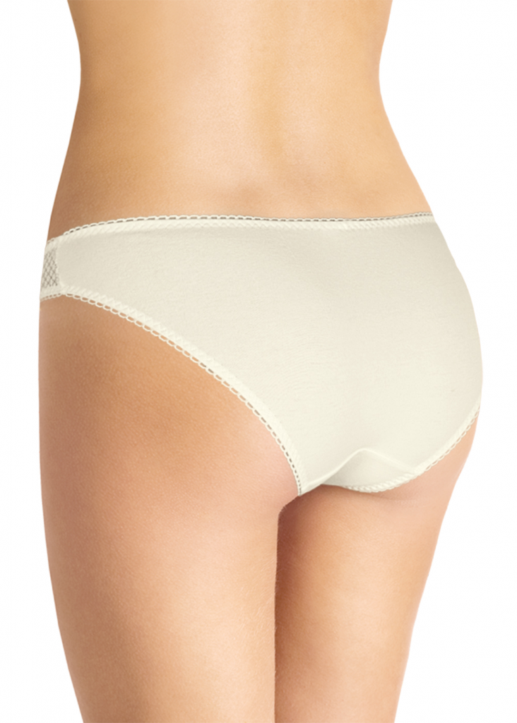 Трусы бикини женские из эластичного хлопкового полотна. По бокам вставки из эластичной сетки. Обработка краев - ажурная резинка с фестоном. Спереди узкое кружево и бант.