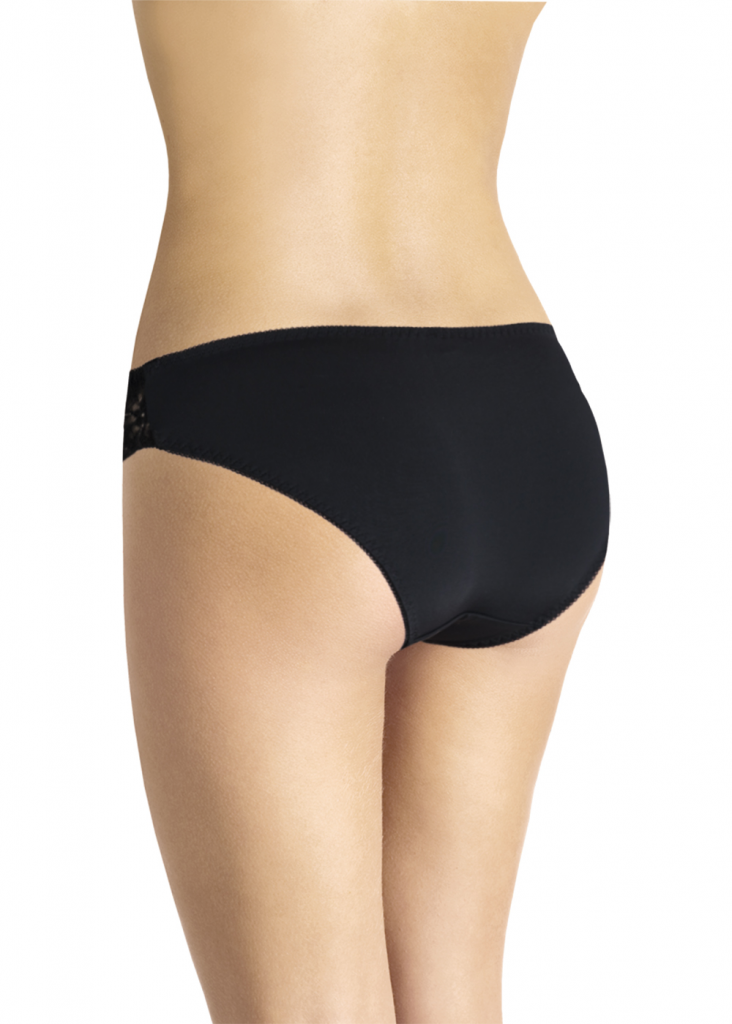 Трусы-бикини женские из полиамида. Обработка краев - ажурная резинка с фестоном. По переду вставки из кружева и бант. Производство Китай.