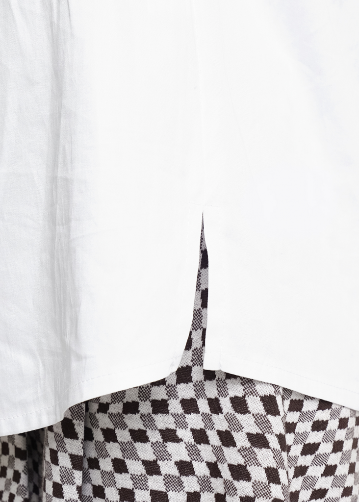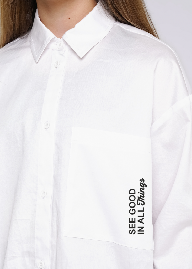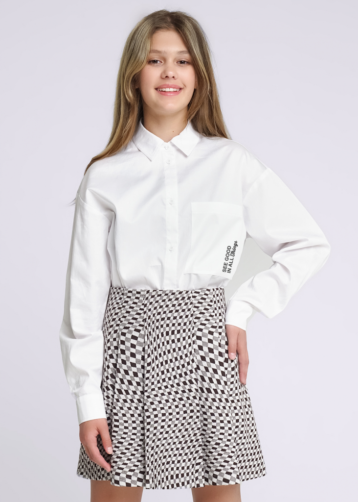 Рубашка из поплина в стиле casual, свободного силуэта. Спущенная линия плеча, рубашечный воротник, застежка на пуговицы, по бокам разрезы. Спереди накладной карман, украшенный принтом. Модель легко впишется в повседневный и школьный гардероб.