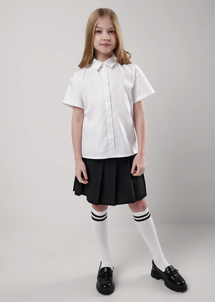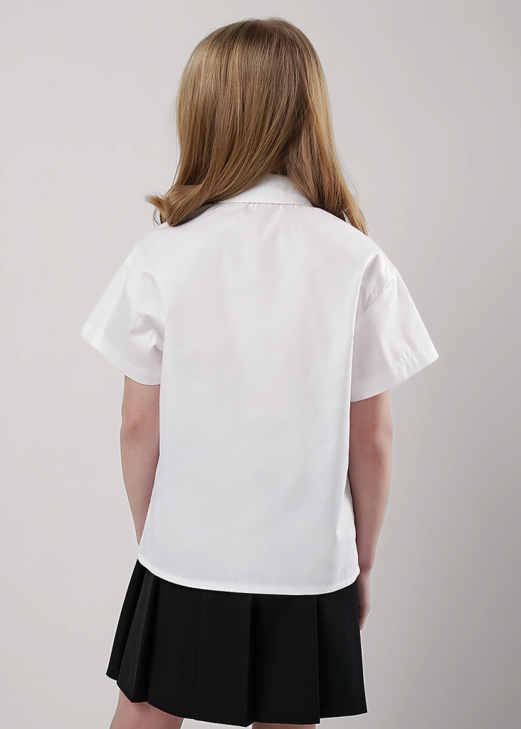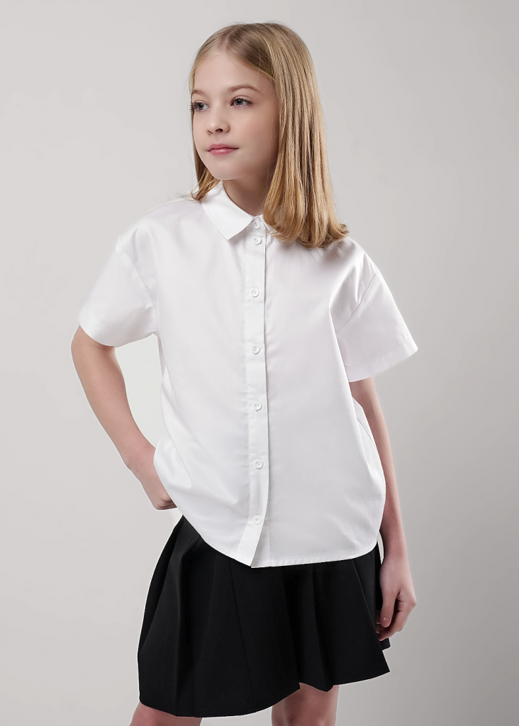 Базовая белая рубашка из поплина станет отличным дополнением к вашему гардеробу. Воротник со стойкой, планка на пуговицах. Модель умеренного объёма с коротким рукавом. Рубашка идеально подойдёт для школьных и повседневных образов.