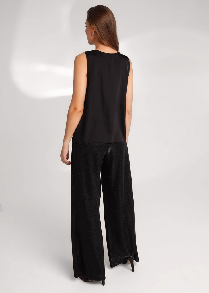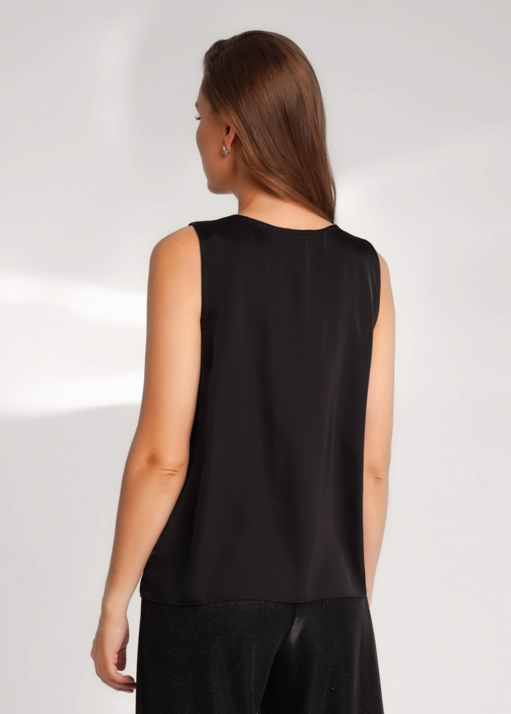 Блузка среднего объема из текстильного полотна атлас стрейч, без рукавов, на широкой бретели. Передняя деталь двойная. По горловине спинки внутренняя окантовка.