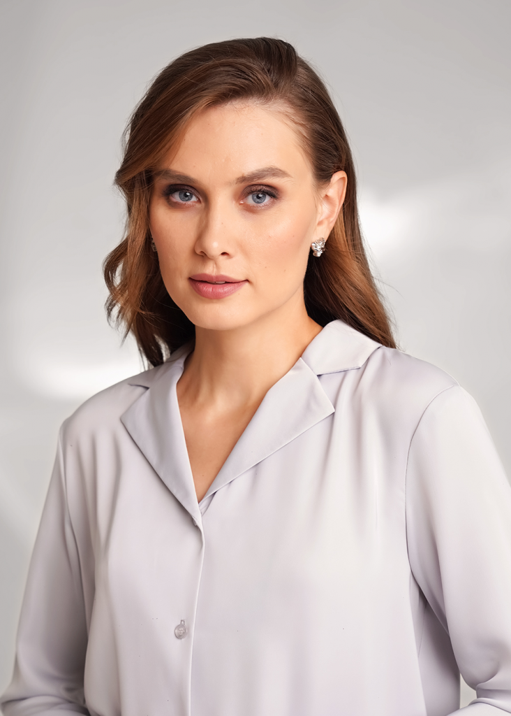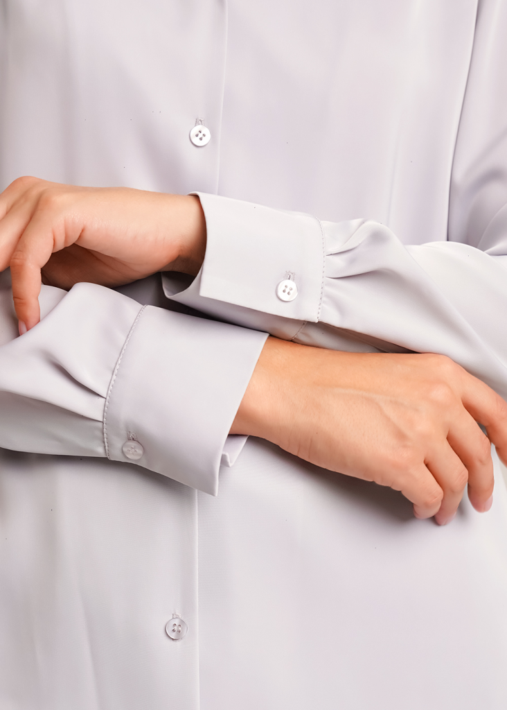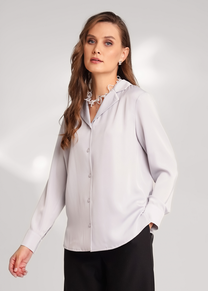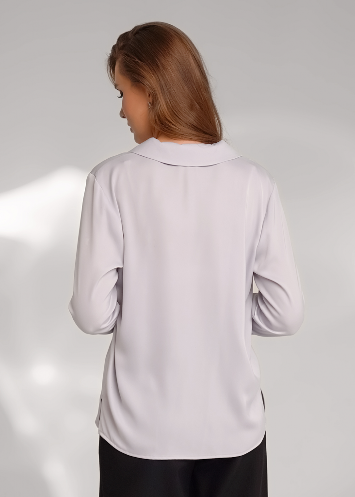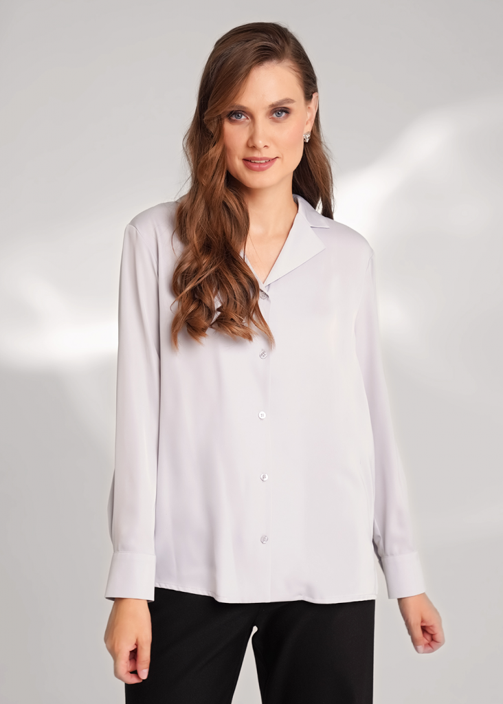 Блузка среднего объема из текстильного полотна атлас стрейч, с застежкой на пуговицы. По горловине воротник с лацканами. Втачной длинный рукав, внизу с манжетом на пуговице. Боковые разрезы.