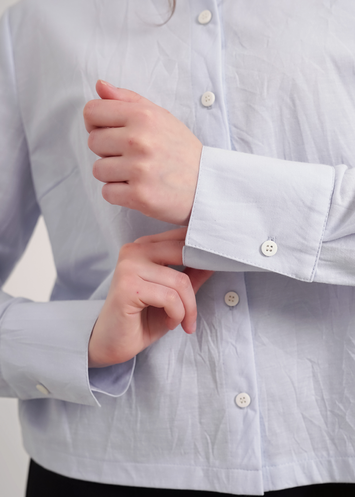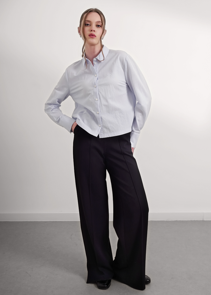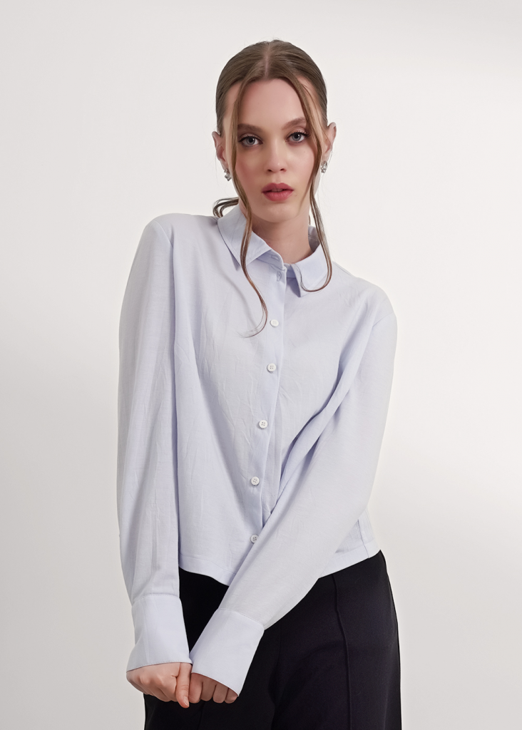 Блузка прямого силуэта из трикотажного полотна, с отложным воротником на стойке. Спереди цельнокроеная планка с застежкой на пуговицы. Длинный втачной рукав, внизу с притачной манжетой и застежкой на пуговицу. По спинке кокетка со складкой.