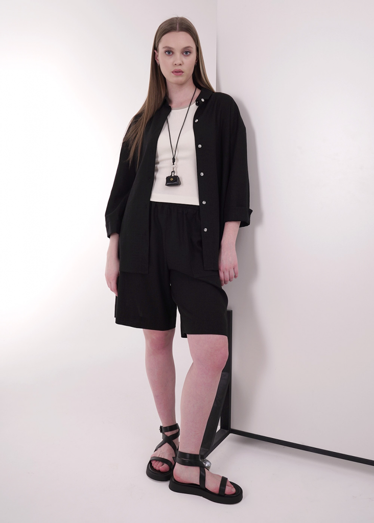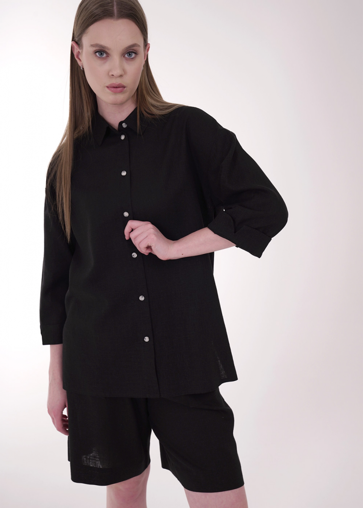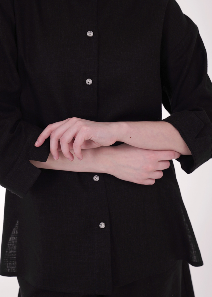 Блузка из текстильного полотна лен с вискозой,прямого силуэта. Длинный рукав со спущенной линией плеча, по низу манжет с разрезом. По борту цельновыкроенная планка с застежкой на пуговицы, по горловине отложной воротник со стойкой. По бокам разрезы.
