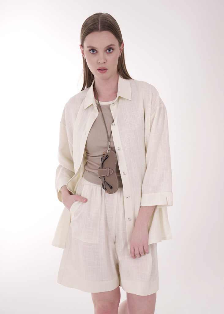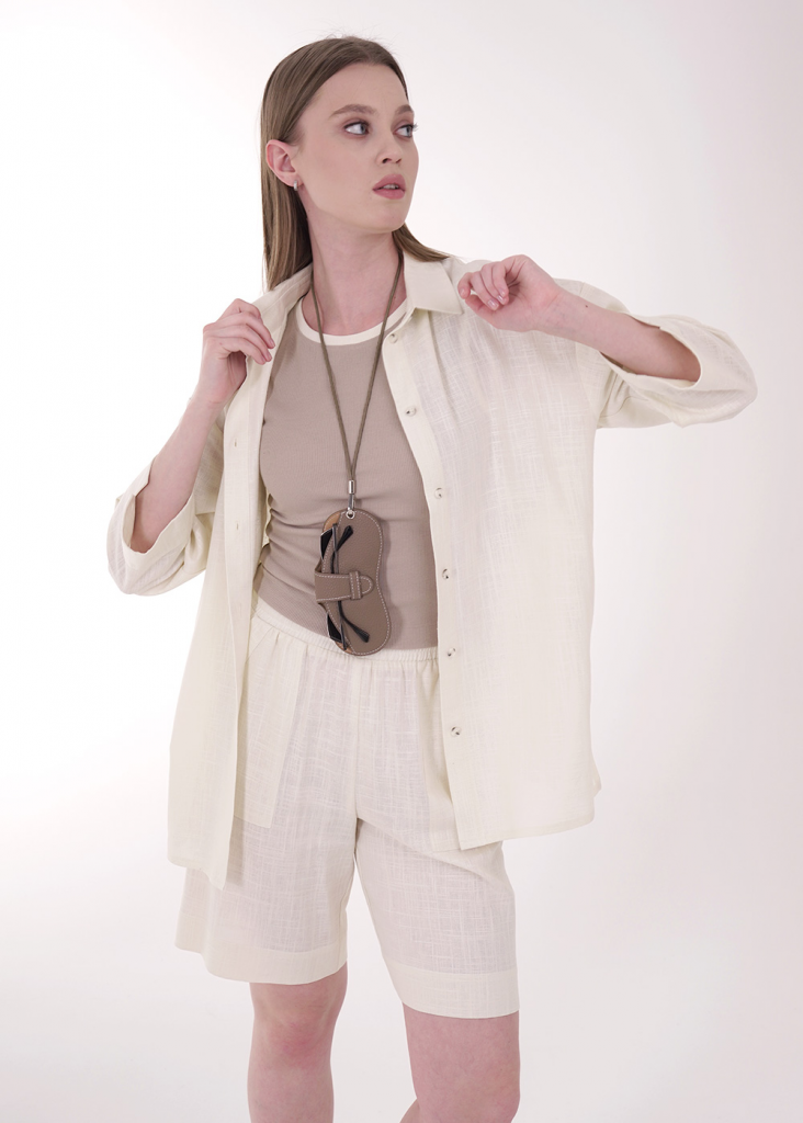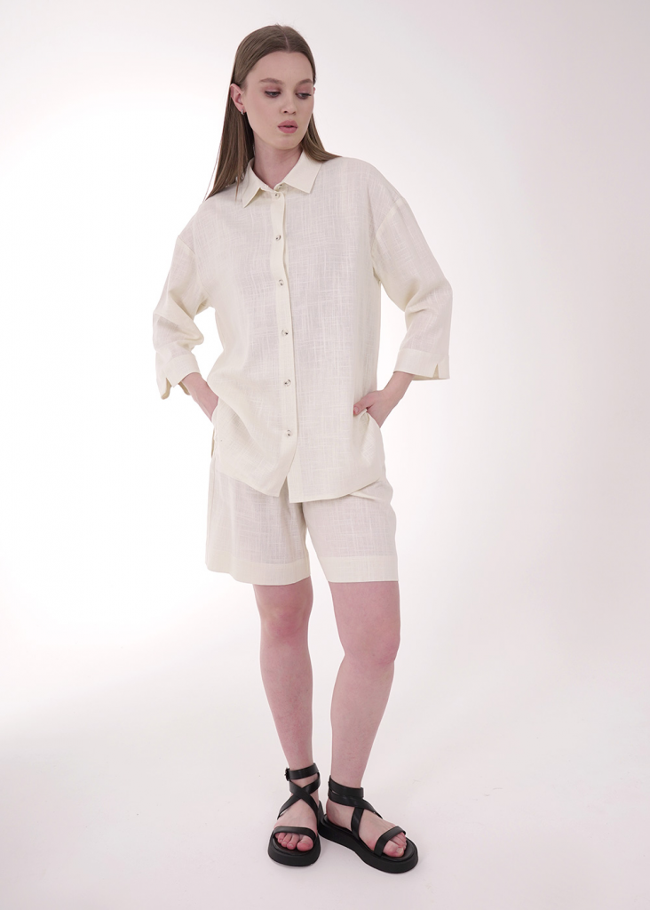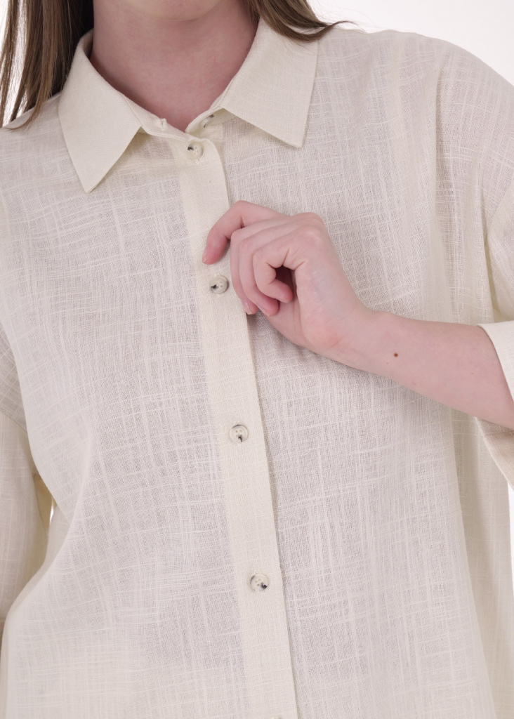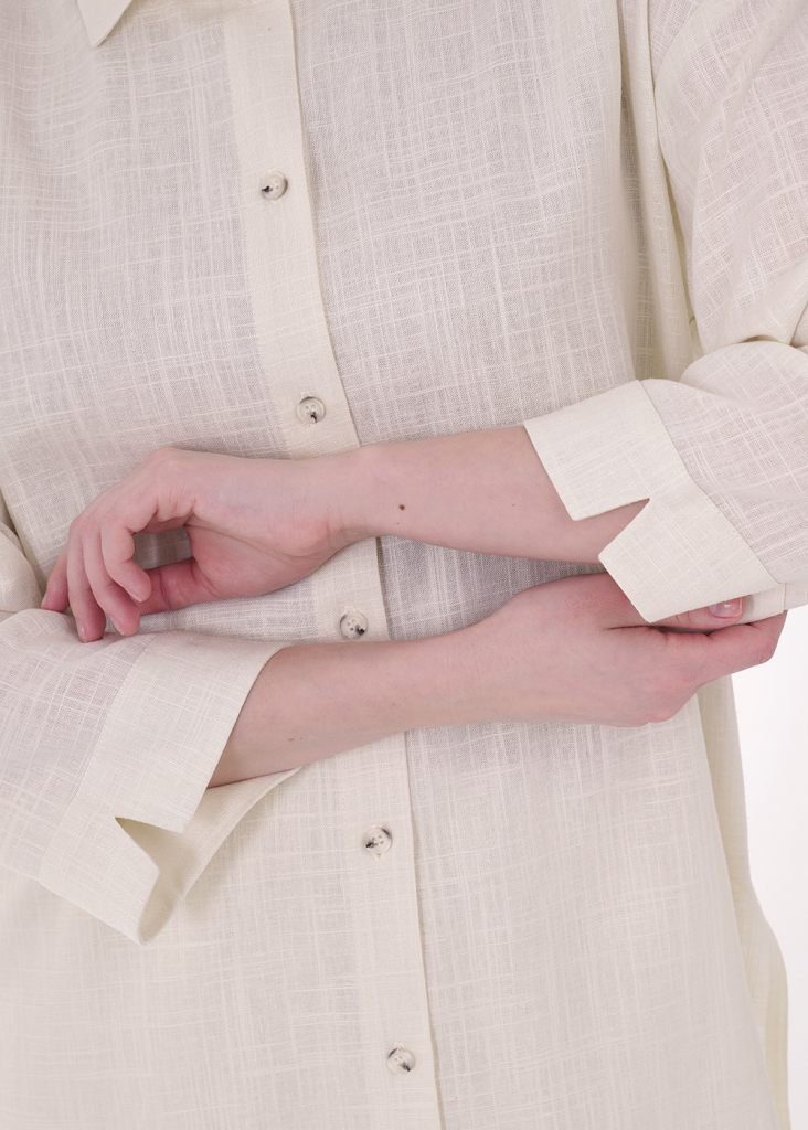 Блузка из текстильного полотна лен с вискозой,прямого силуэта. Длинный рукав со спущенной линией плеча, по низу манжет с разрезом. По борту цельновыкроенная планка с застежкой на пуговицы, по горловине отложной воротник со стойкой. По бокам разрезы.