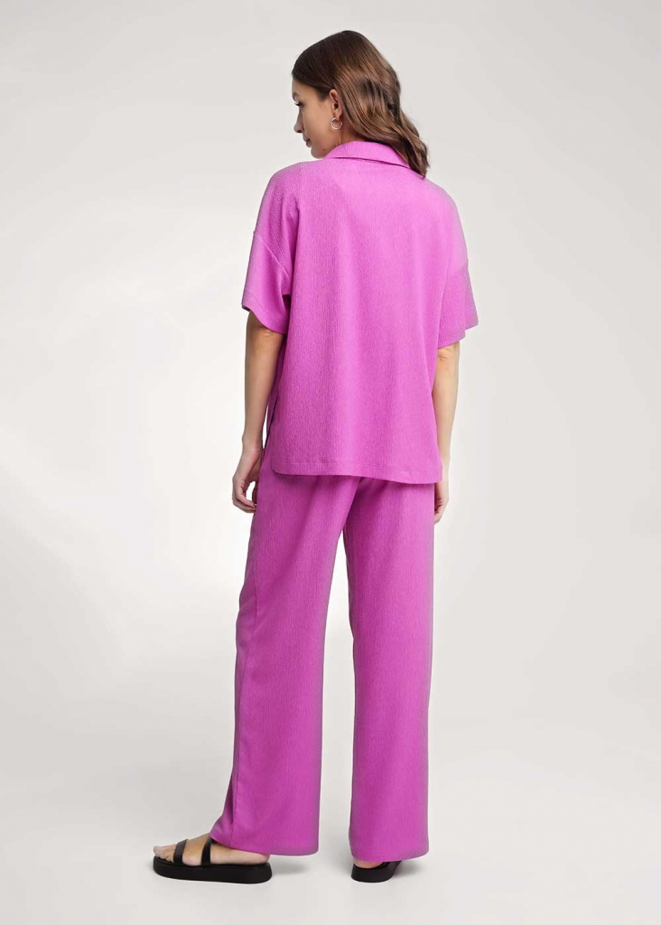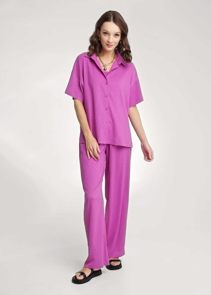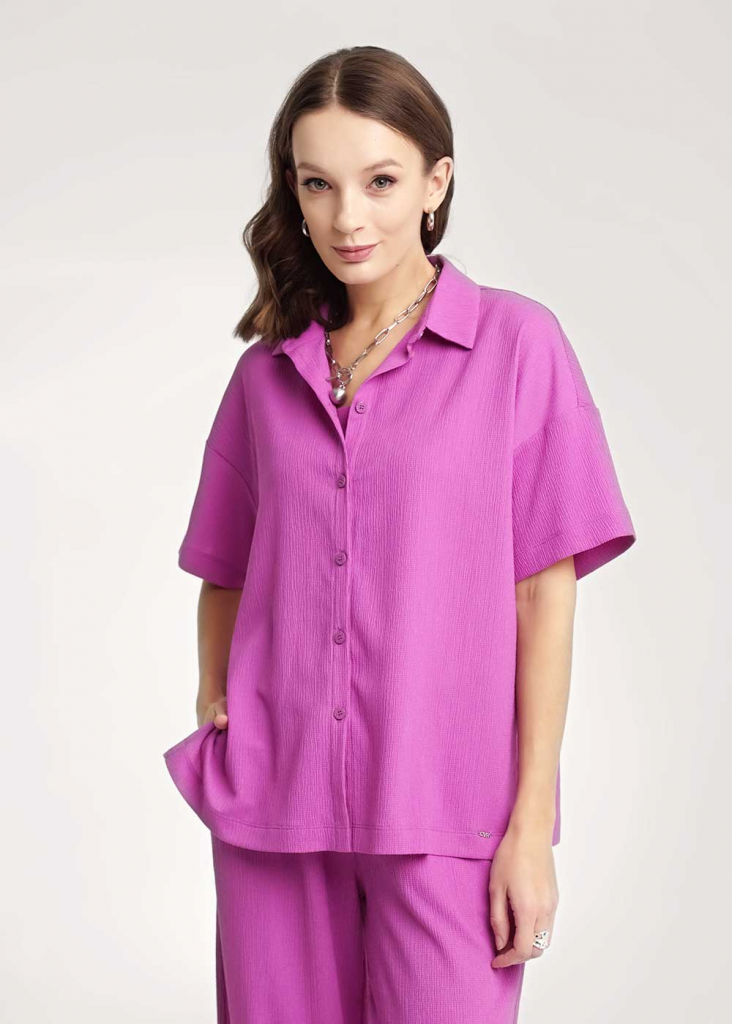 Блузка из вискозного трикотажного полотна джерси, свободного кроя. Втачной короткий рукав. Отложной воротник со стойкой, спереди цельнокроеная планка на пуговицах. Боковые разрезы, нашивка металл.