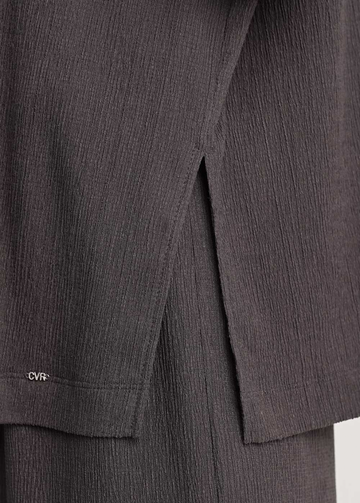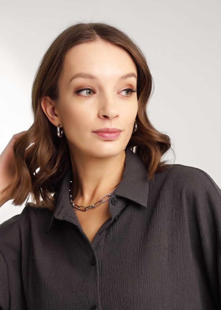 Блузка из вискозного трикотажного полотна джерси, свободного кроя. Втачной короткий рукав. Отложной воротник со стойкой, спереди цельнокроеная планка на пуговицах. Боковые разрезы, нашивка металл.