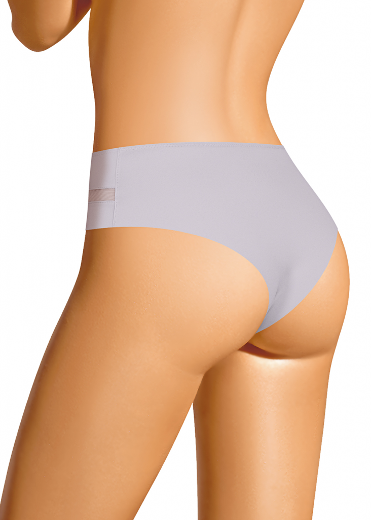 Трусы бразилиана с завышенной посадкой, сзади и сбоку бесшовная гладкая обработка, спереди декоративные горизонтальные вставки из плотной сетки, перед дублирован сеткой, по талии обработка с зигзагом и узкой резинкой