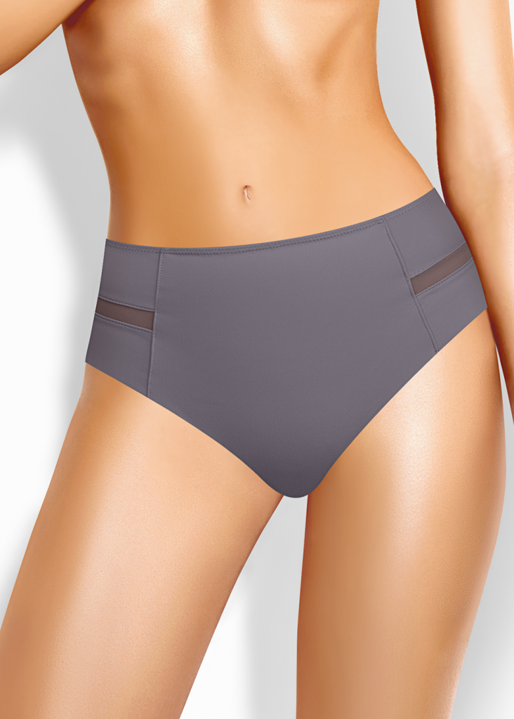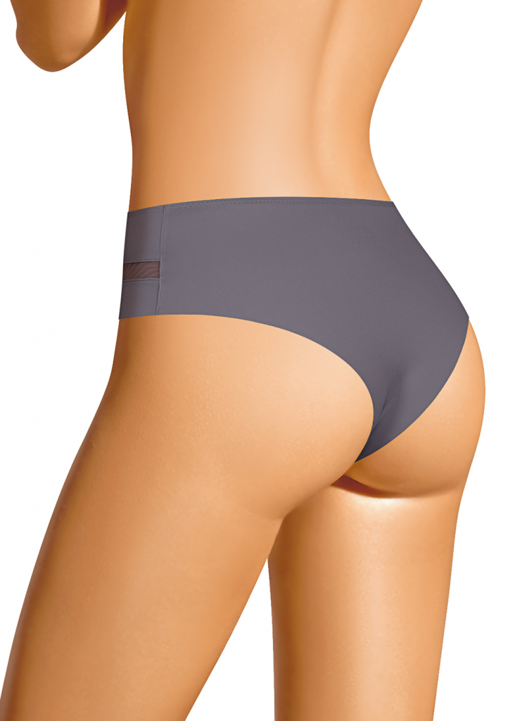 Трусы бразилиана с завышенной посадкой, сзади и сбоку бесшовная гладкая обработка, спереди декоративные горизонтальные вставки из плотной сетки, перед дублирован сеткой, по талии обработка с зигзагом и узкой резинкой