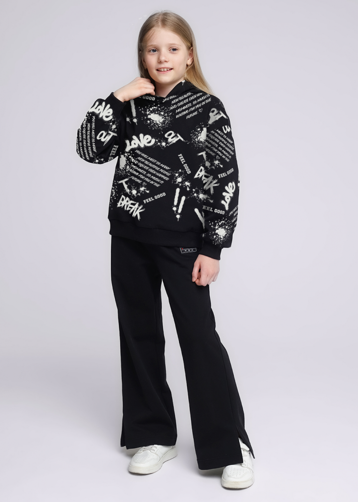 Расклешённые брюки из футера - мастхэв осеннего гардероба. Эластичный пояс и регулировка шнуром обеспечивают удобную посадку. Спереди модель дополнена оригинальной нашивкой.
