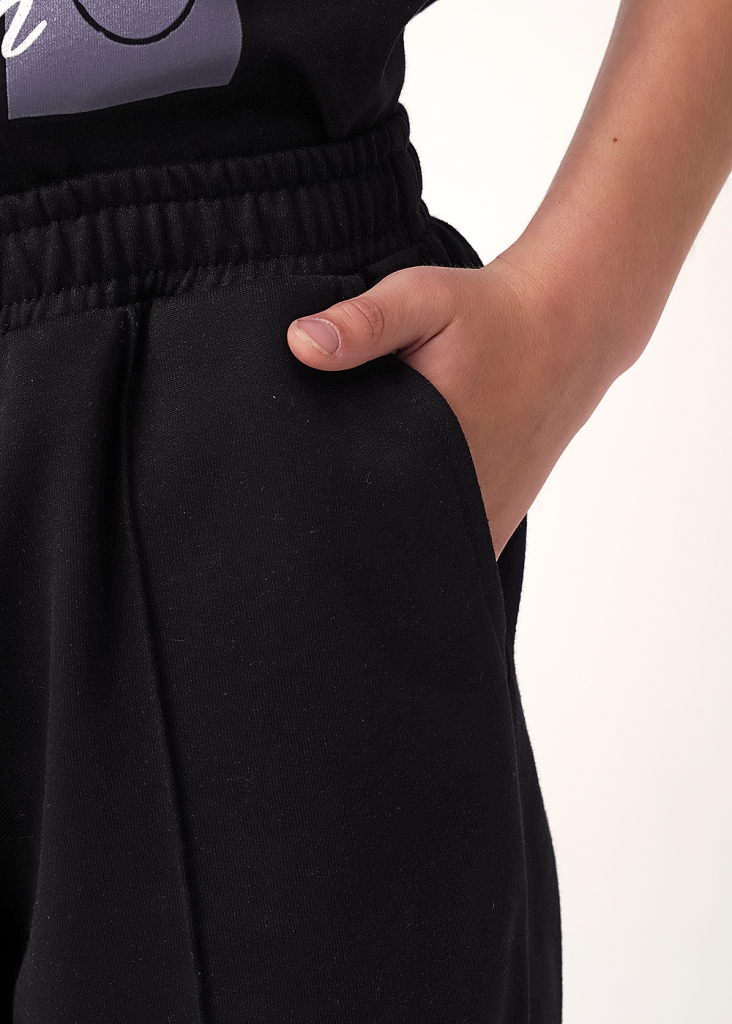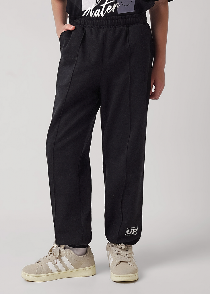 Стильные брюки из мягкого футера отлично дополнят ваш гардероб! Эластичный пояс обеспечит комфорт и идеальную посадку. Модель с декоративными защипами спереди дополнена стильной минималистичной нашивкой и манжетами по низу.