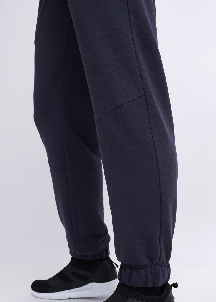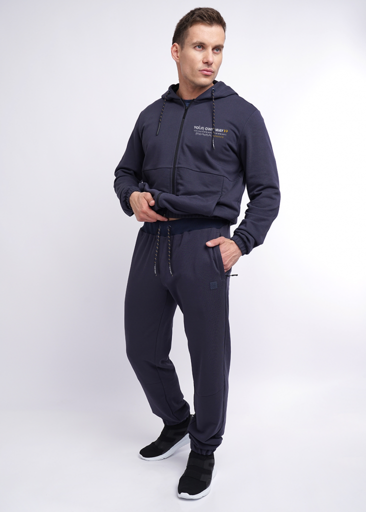 Мужские брюки из футера на эластичном поясе с пестрым шнуром и манжетах. Для функциональности предусмотрены боковые карманы на молнии. Спереди косые резы в области колена, а так же силиконовая нашивка и шрифтовой принт. Подойдут для активного отдыха.