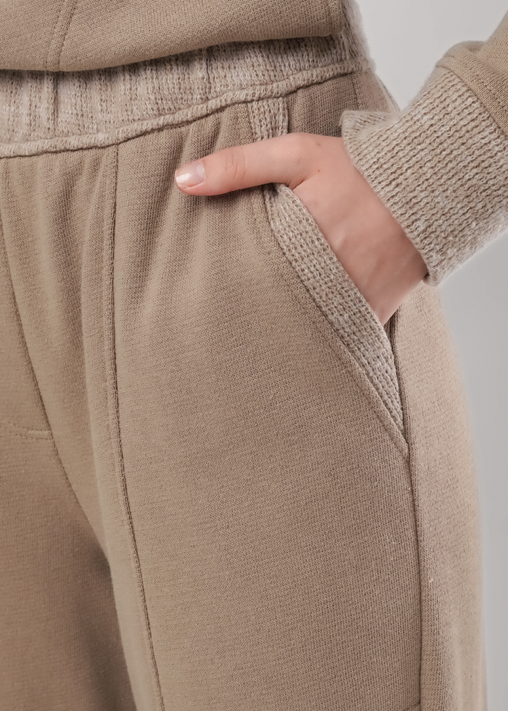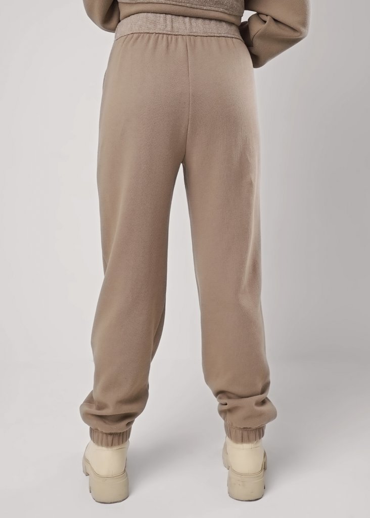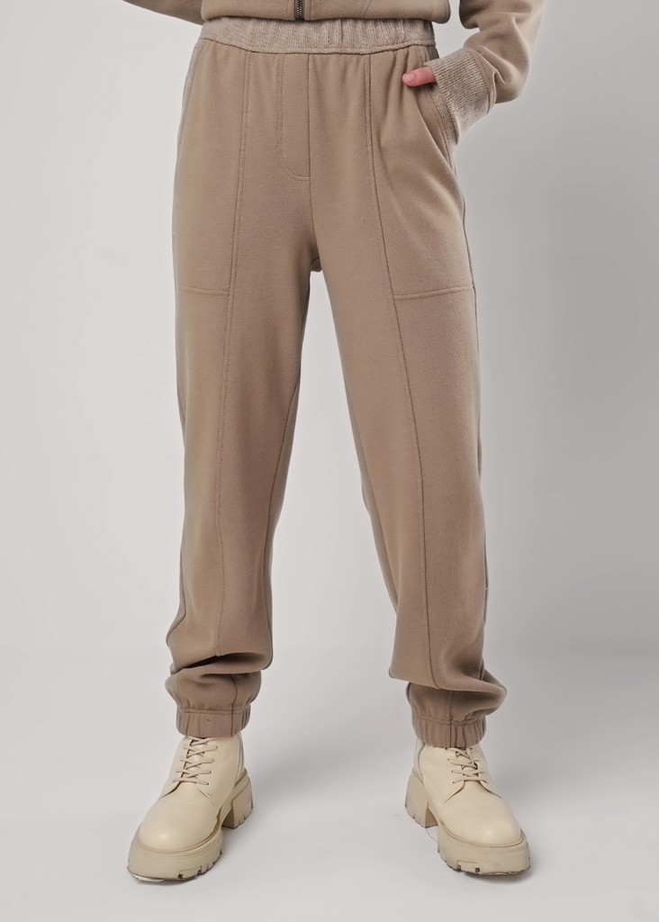 Брюки прямые из трикотажного полотна вискоза вязанная. По талии притачной пояс на внутренней резинке (ворс). Имитация гульфика. По переду декоративный рез. Боковые карманы с отрезным бочком и обтачкой (ворс). По низу брюк подгибка на резинке.