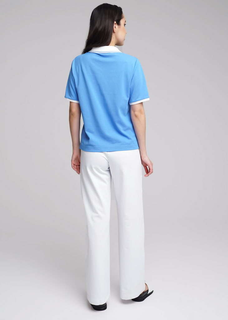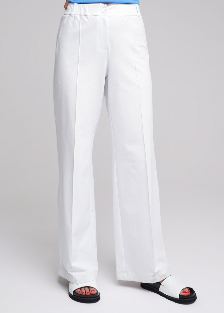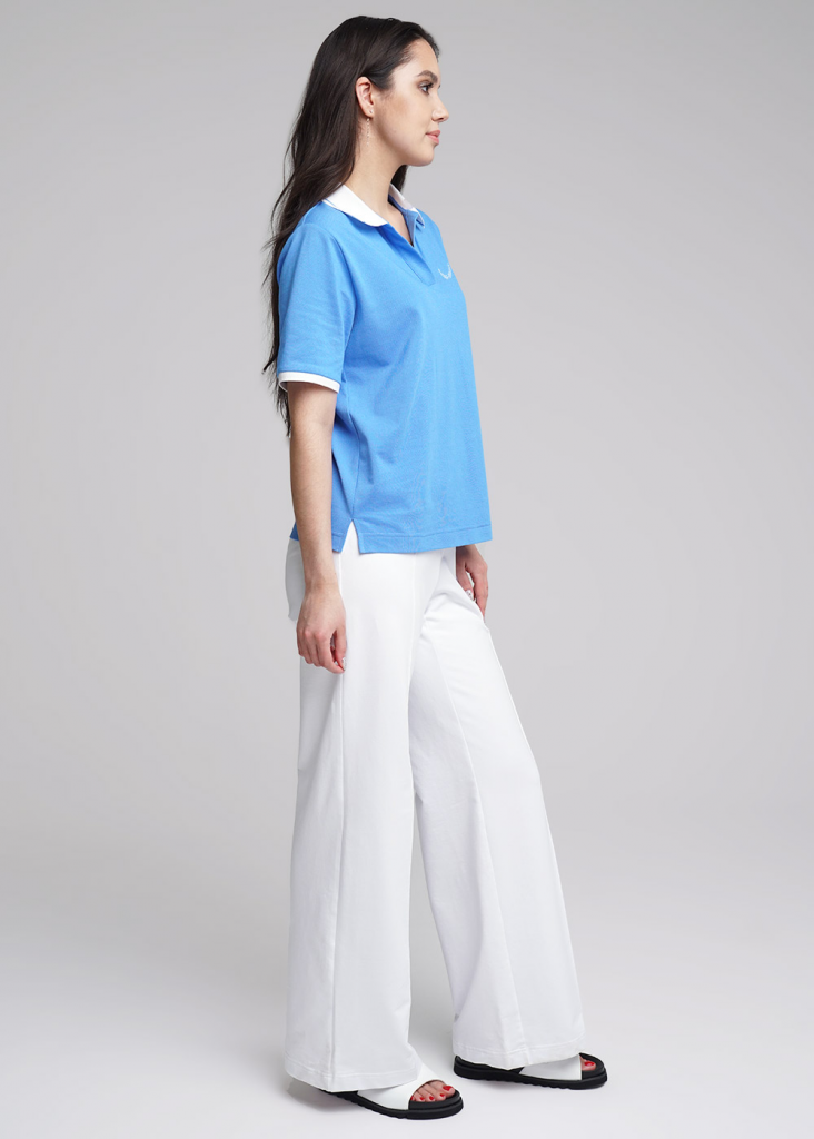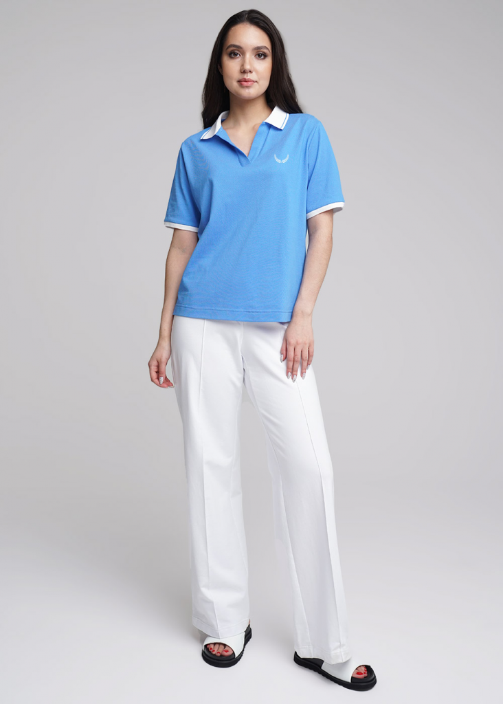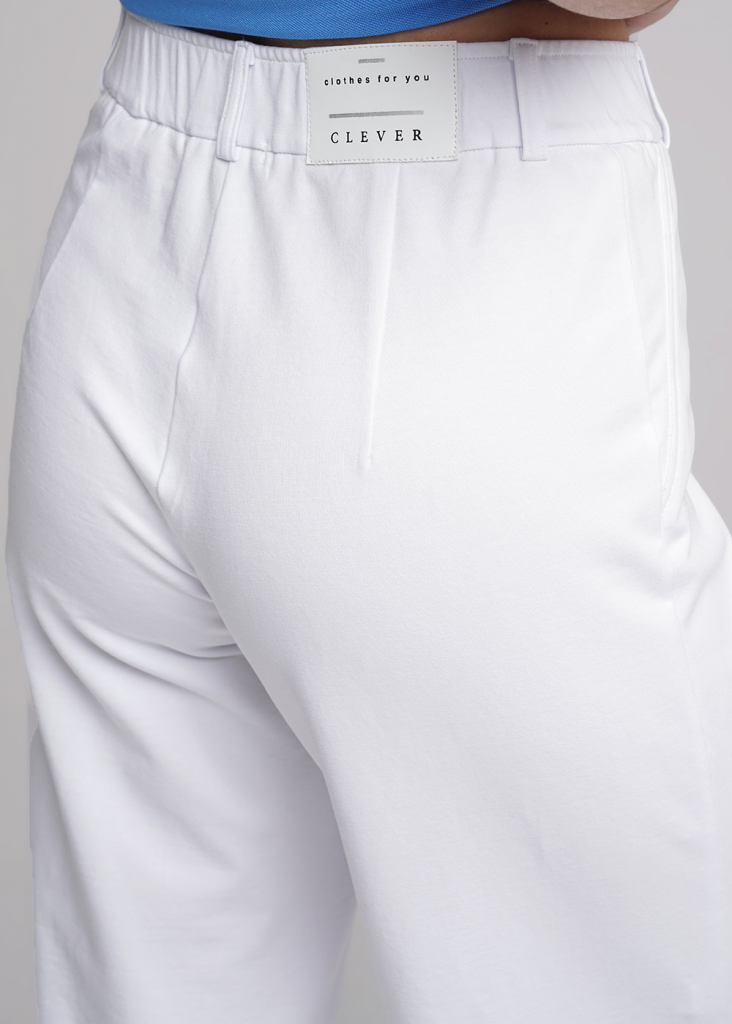 Брюки из футера свободного кроя. Притачной пояс с функциональным гульфиком и шлёвками. На детали переда застроченный рельеф. На поясе по спинке кожаная нашивка.