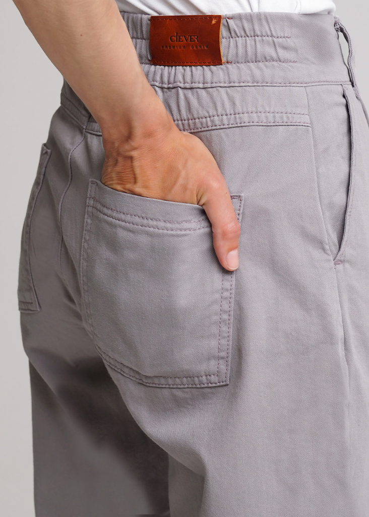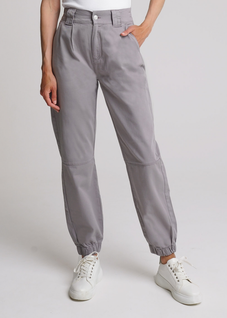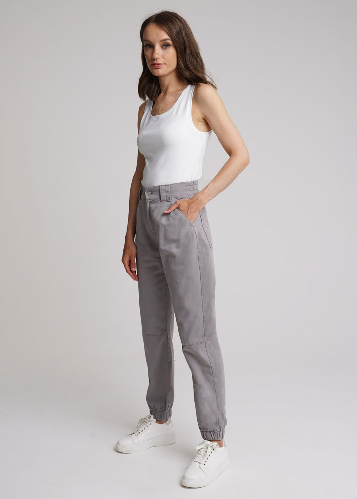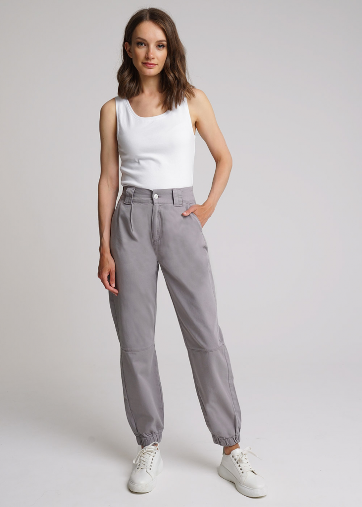 Брюки умеренного объема, комфортной посадки из габардина. Функциональный гульфик. По бокам карманы. Низ брюк на резинке. На детали переда защипы. На колене рез.