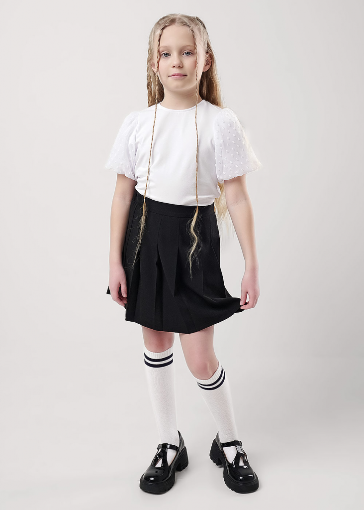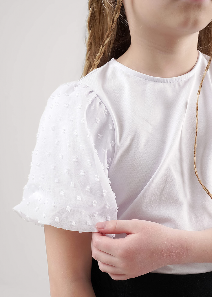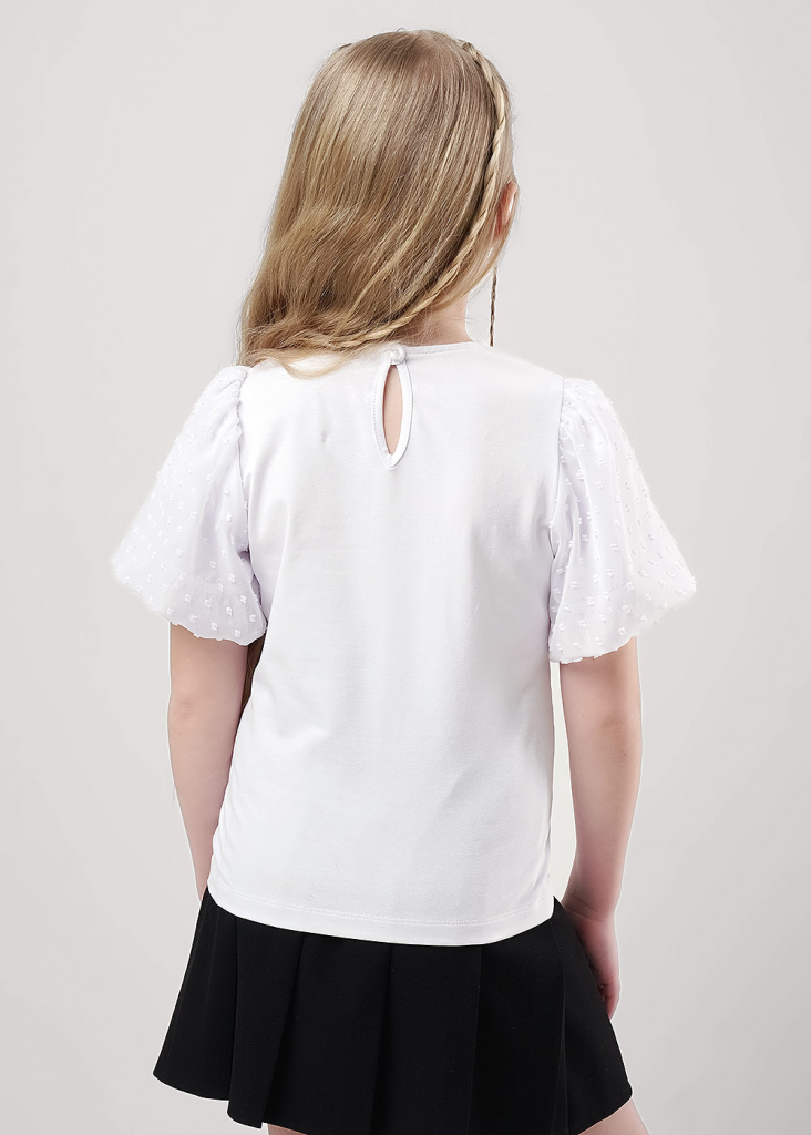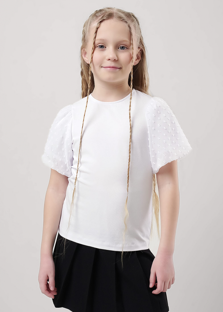 Стильная блузка станет отличным дополнением к вашему гардеробу! Модель выполнена из хлопкового полотна с добавлением эластана. Блузка с короткими пышными рукавами из шифона, она отлично подойдет для создания классных школьных образов!