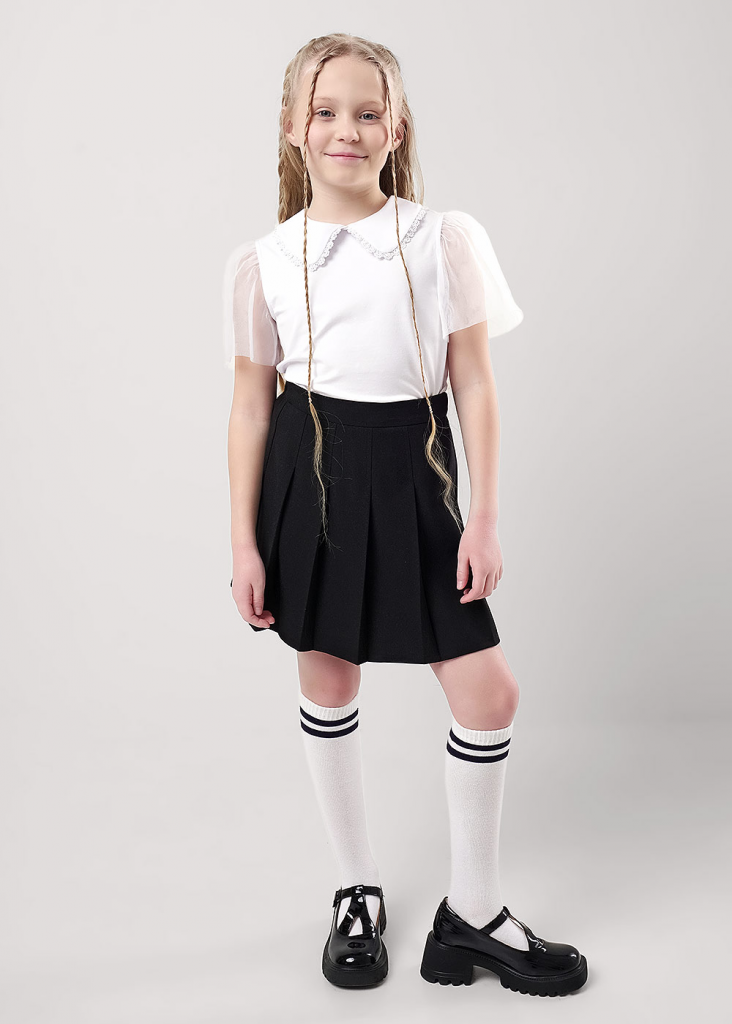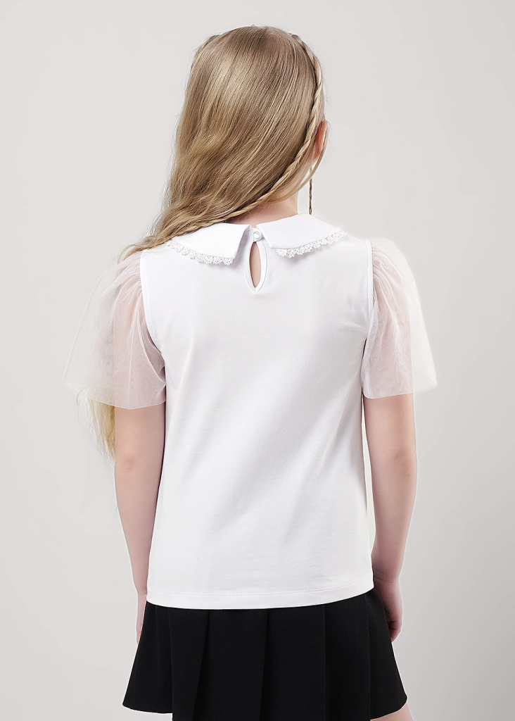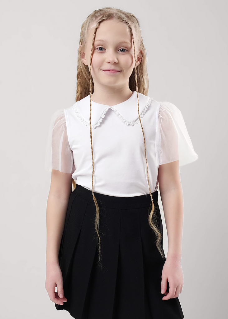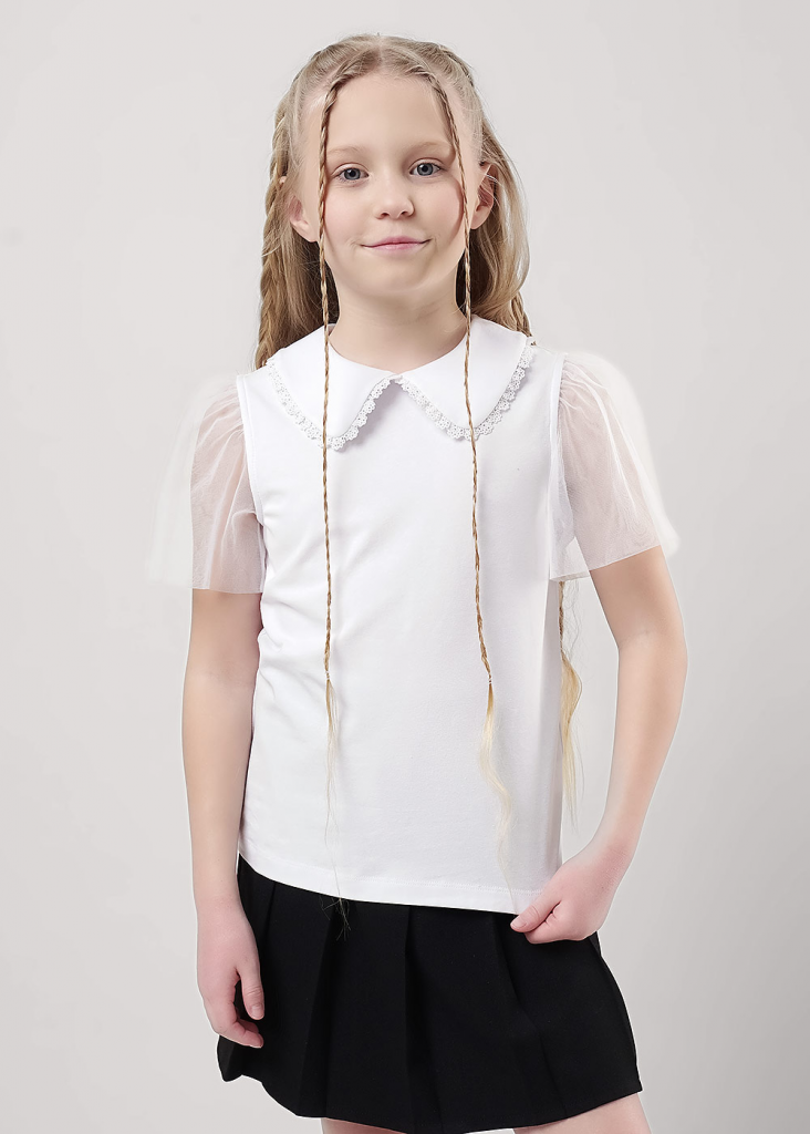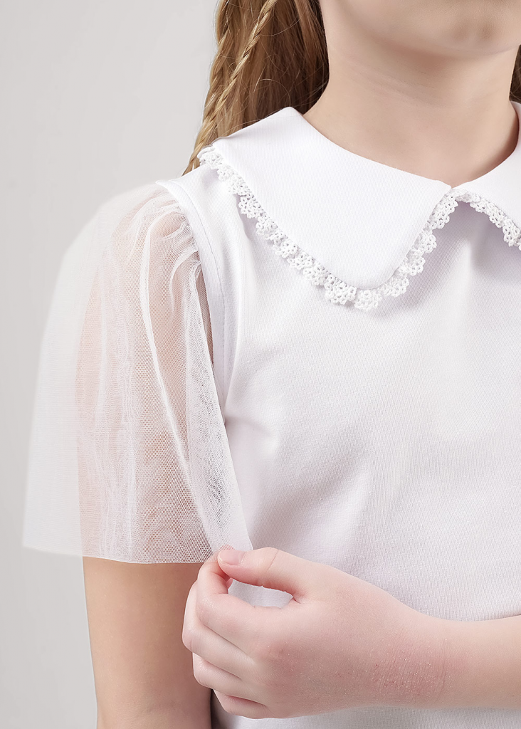 Стильная блузка с воротничком станет отличным дополнением к вашему гардеробу! Модель выполнена из хлопкового полотна с добавлением эластана. Блузка с короткими пышными рукавами из сетки. Модель отлично подойдет для создания классных школьных образов!