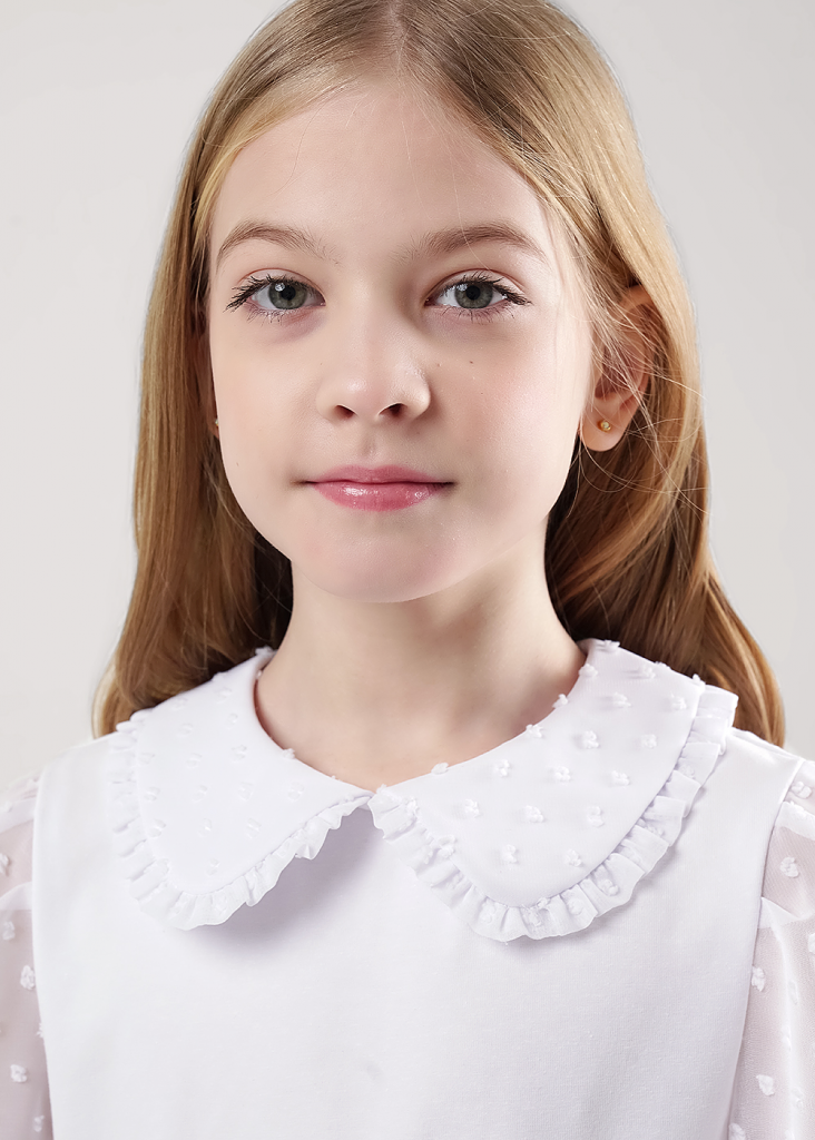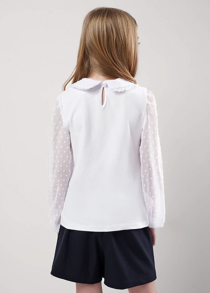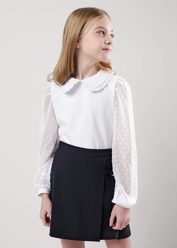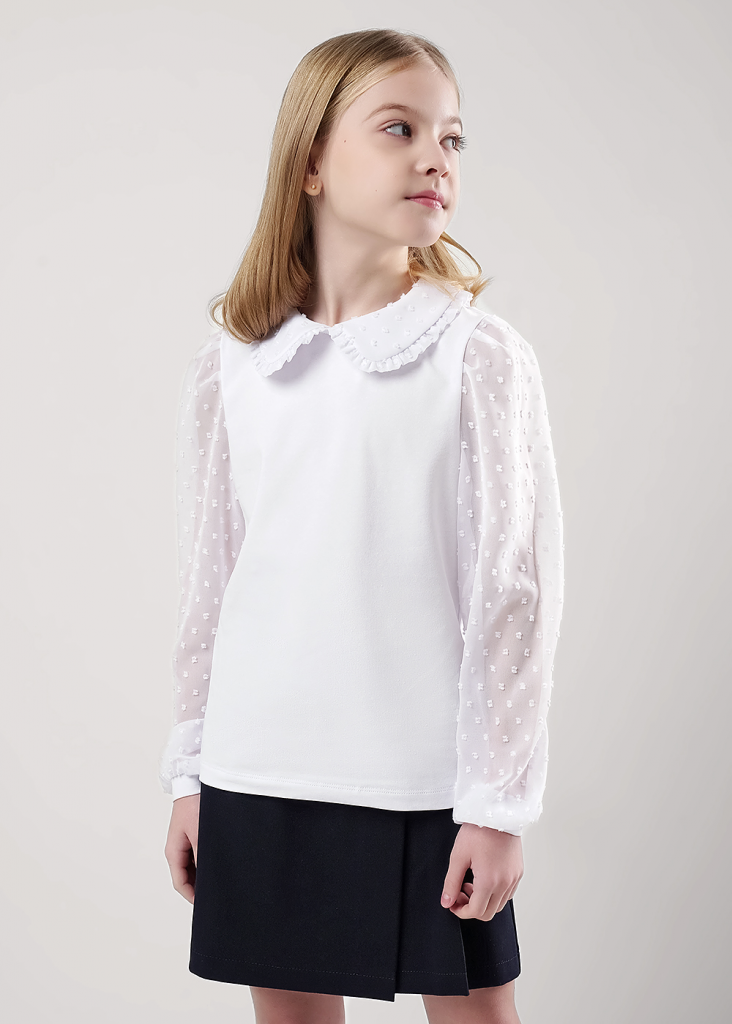 Стильная блузка с отложным воротником станет отличным дополнением к вашему гардеробу! Модель из хлопкового полотна с добавлением эластана. Блузка с длинными объёмными рукавами из шифона отлично подойдет для создания повседневных и школьных образов!