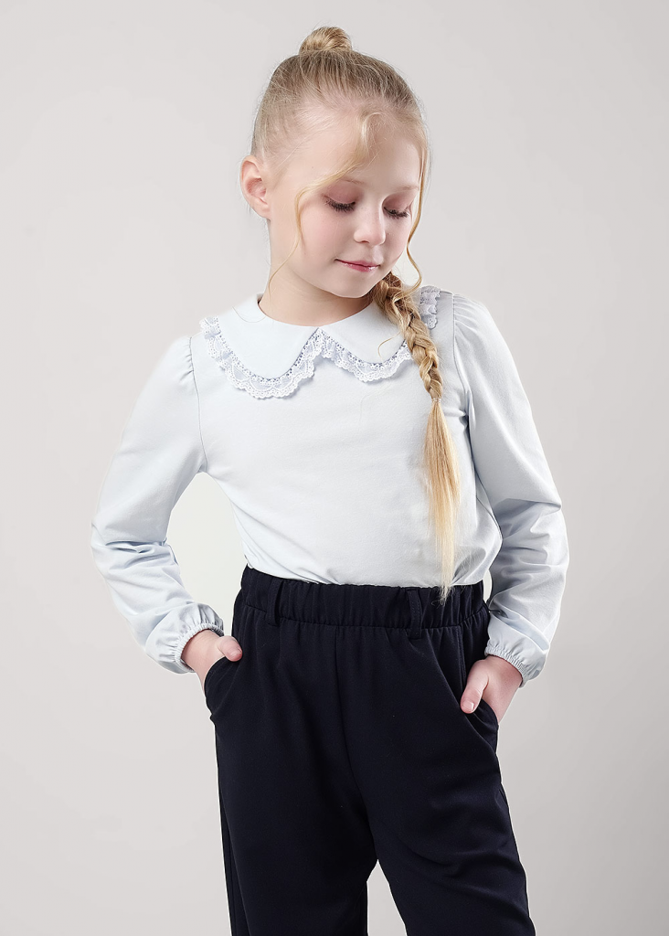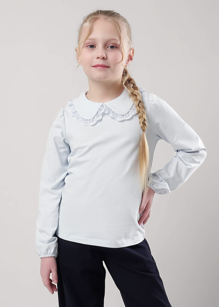 Стильная блузка с отложным воротником станет отличным дополнением к вашему гардеробу! Модель выполнена из хлопкового полотна с добавлением эластана. Блузка с длинными объёмными рукавами отлично подойдет для создания повседневных и школьных образов!