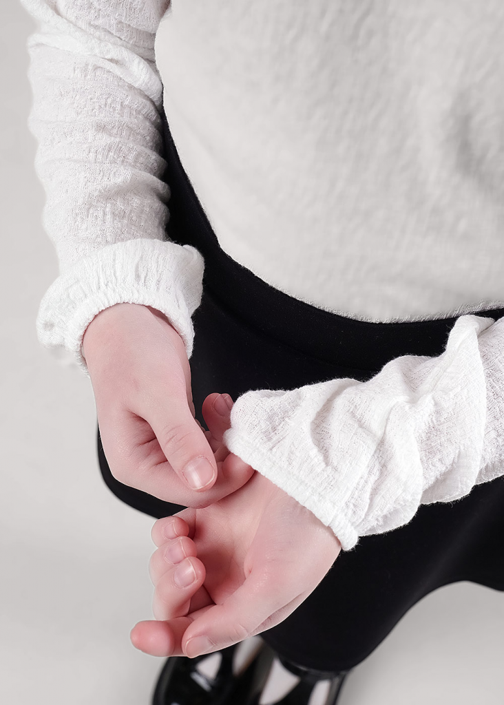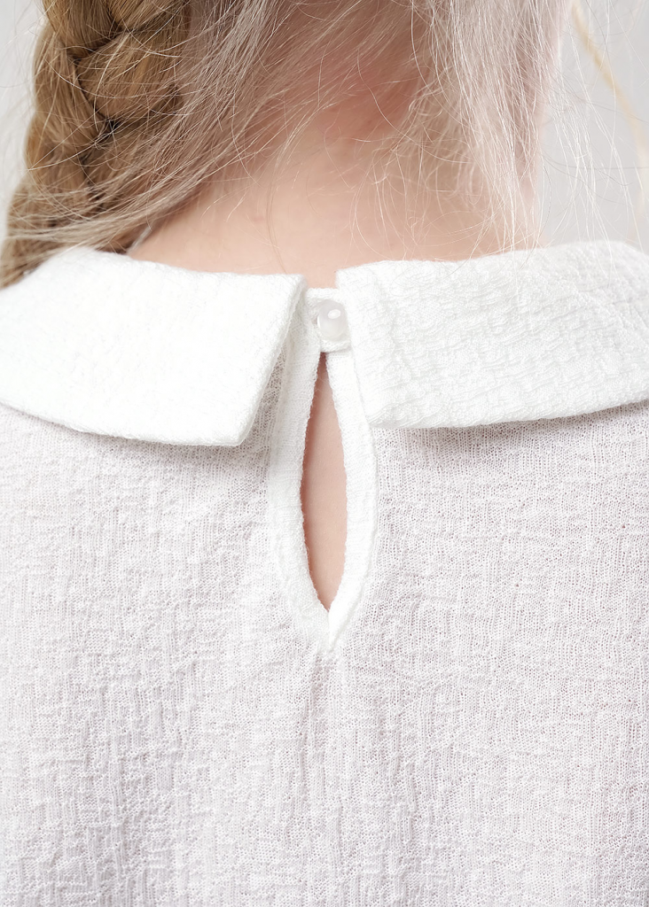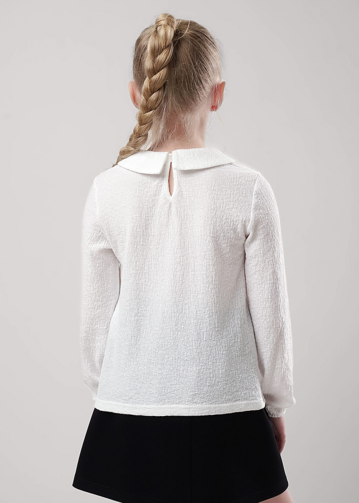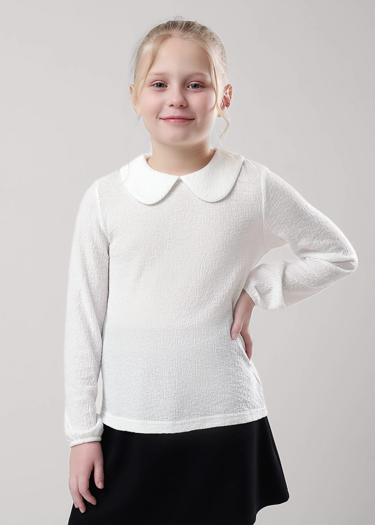 Стильная блузка из фактурного полотна станет отличным дополнением к вашему гардеробу! Модель с отложным воротником дополнена длинными рукавами с резинкой по низу. Блузка отлично подойдет для создания повседневных и школьных образов!