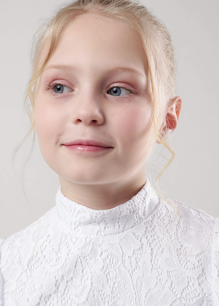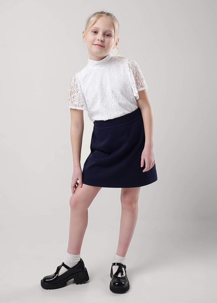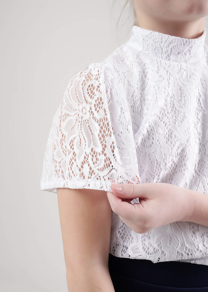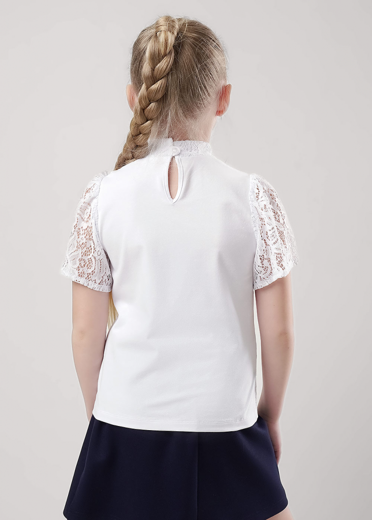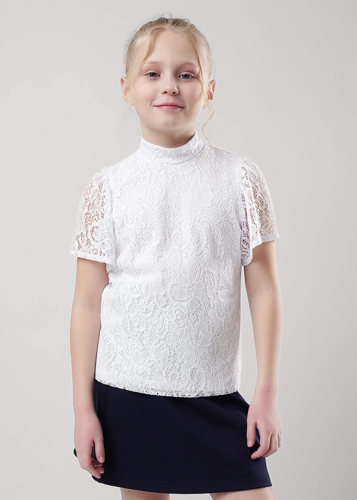 Стильная блузка прекрасно дополнит любой гардероб! Модель со стойкой и рукавами- крылышками выполнена из ажурного кружева. Спинка из хлопкового трикотажа с эластаном.Блузка отлично подойдет для создания классных школьных образов и отличного настроения!