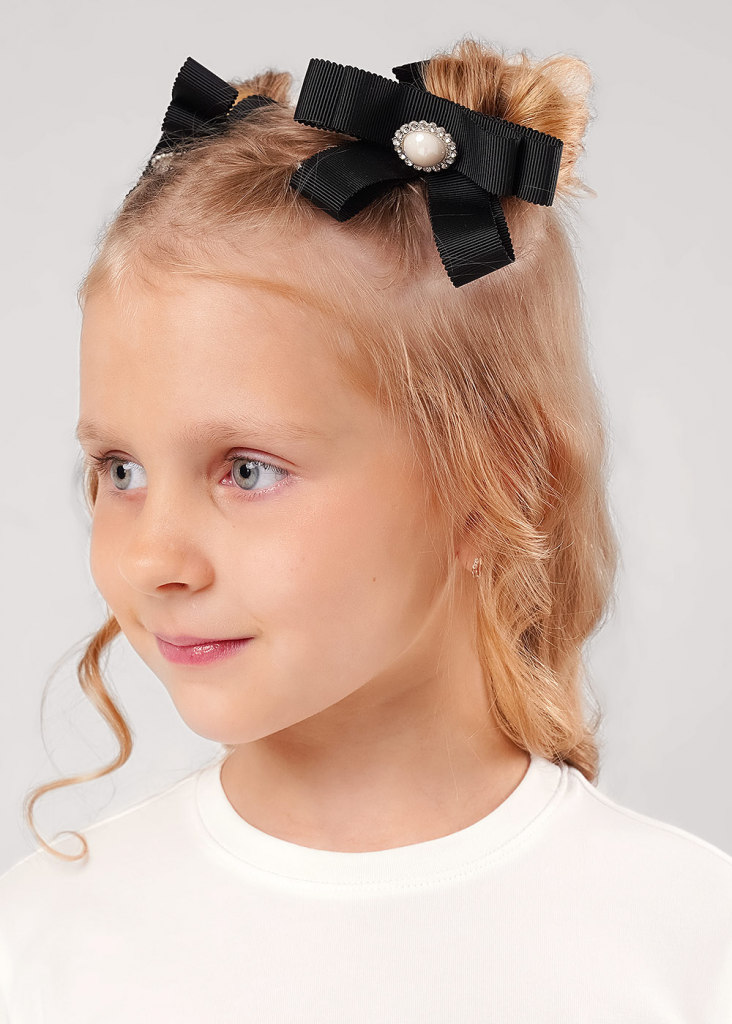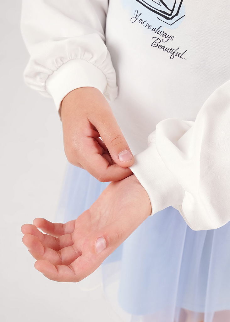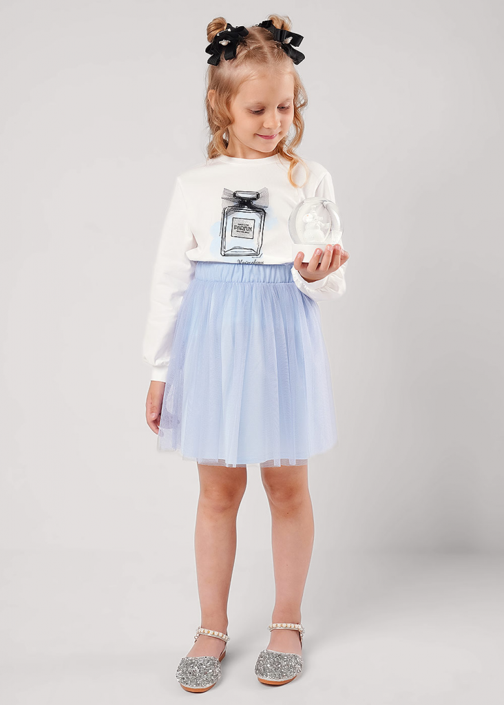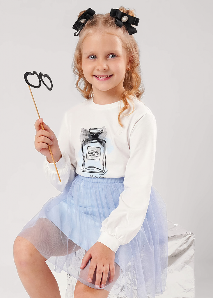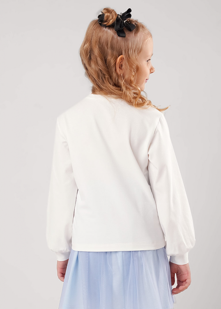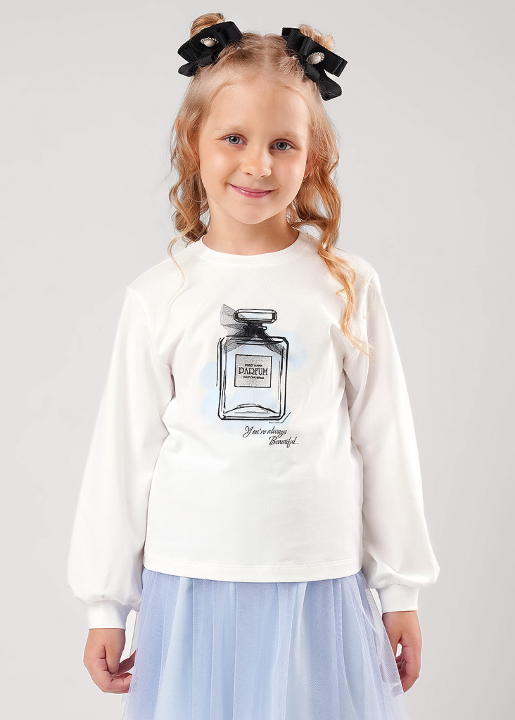 Нарядный джемпер для девочки - незаменимая вещь для праздничных образов! Модель украшена принтом и пришивным бантом. Длиный объемный рукав, круглая эластичная горловина. Выполнен из хлопкового трикотажа с эластаном.