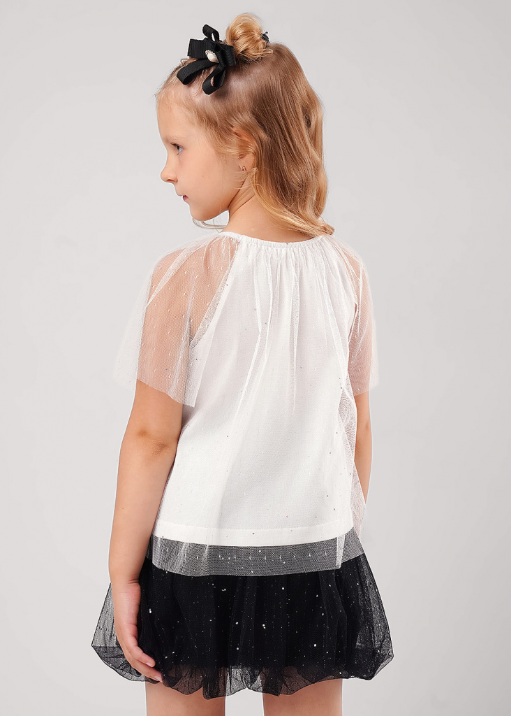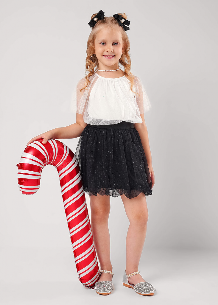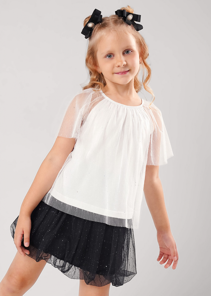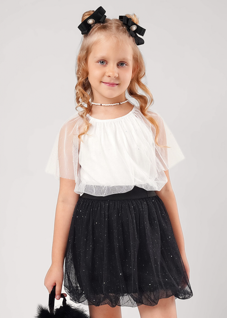Нарядная блузка для девочки выделяется мерцающим верхним слоем из стеки. Внутри модель из хлопкового трикотажа с эластаном. Горовина со сборкой на резинке, пышные рукава.