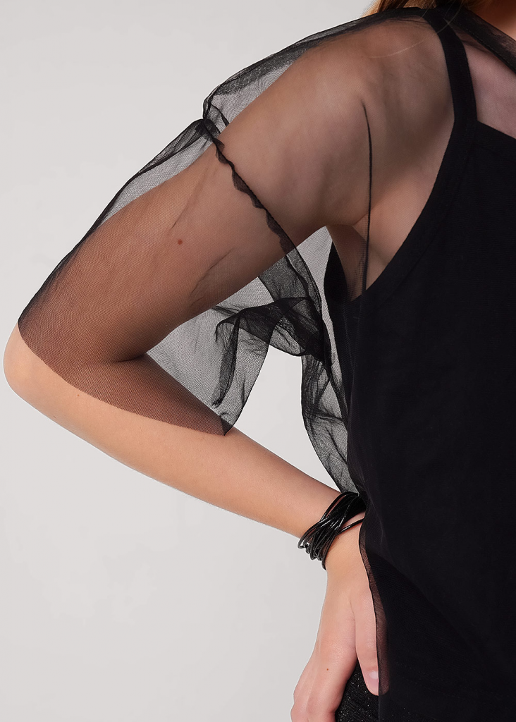 Двухслойная футболка для девочки. Рукава и верхний слой выполнены из сетки, нижний слой - из хлопкового трикотажа с эластаном. Свободная посадка. Стильная модель для праздника.