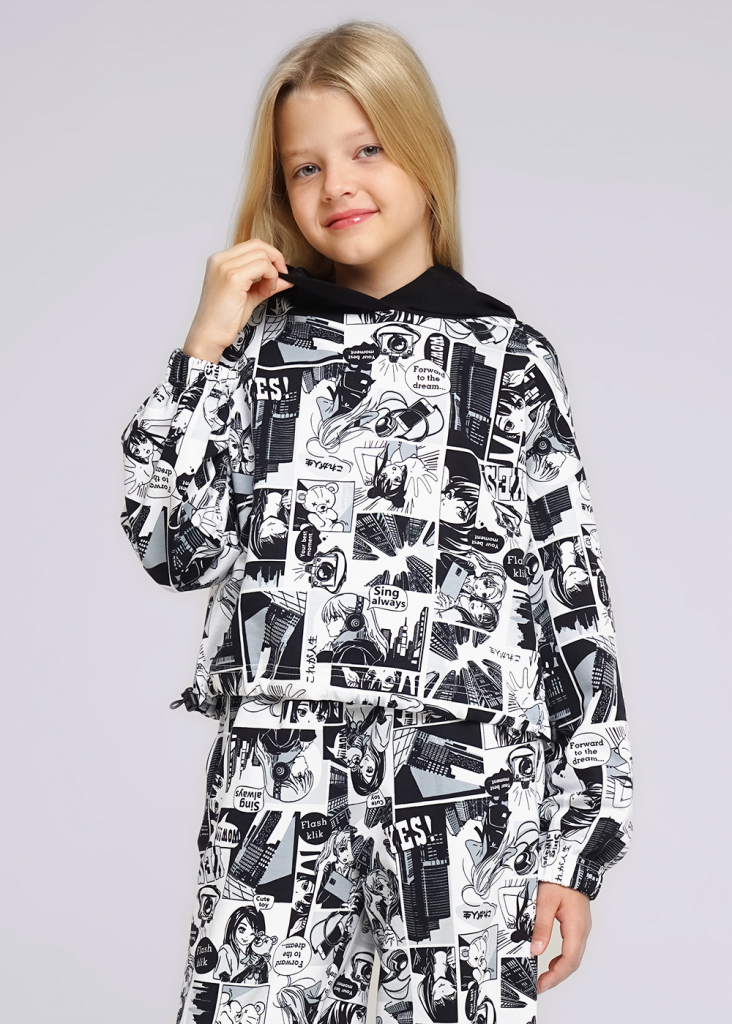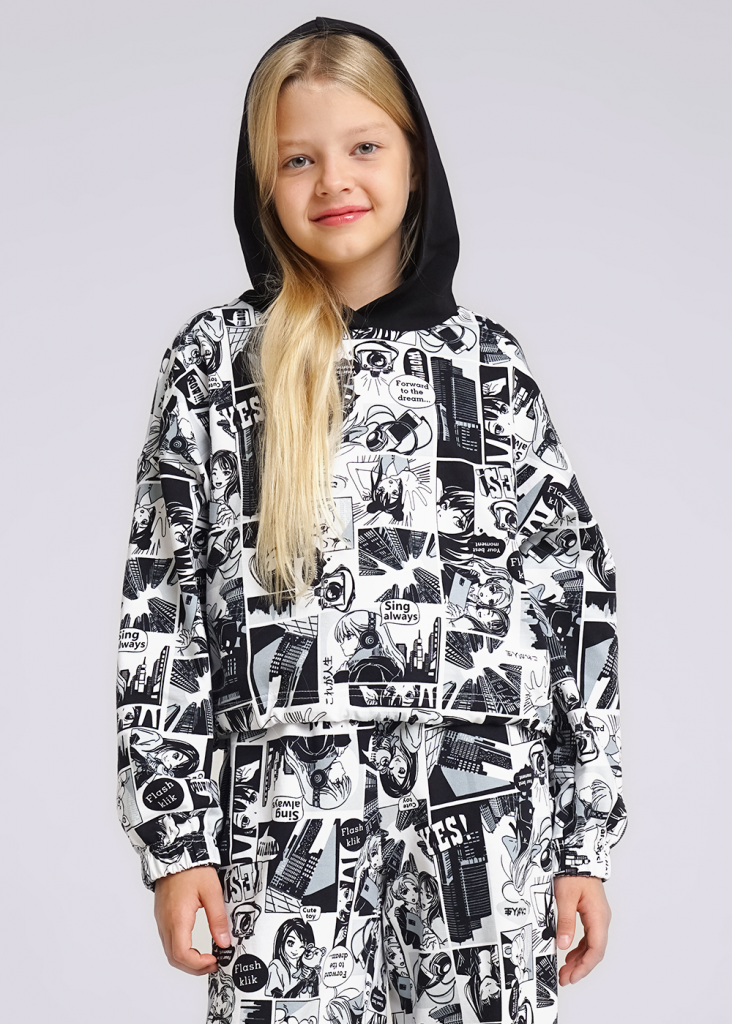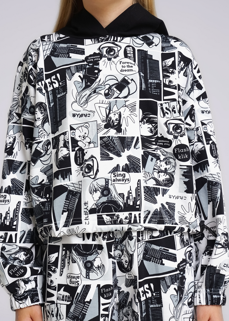 Принтованное кроп-худи в стиле аниме - хит сезона! Фиксатры по низу изделия для регулировки объема и удобный капюшон - добавляют практичности. Для создания модного образа в стиле total look cочетайте модель с принтованными брюками в цвет.