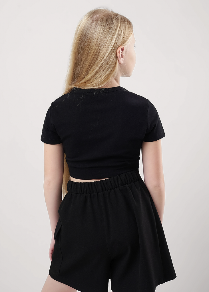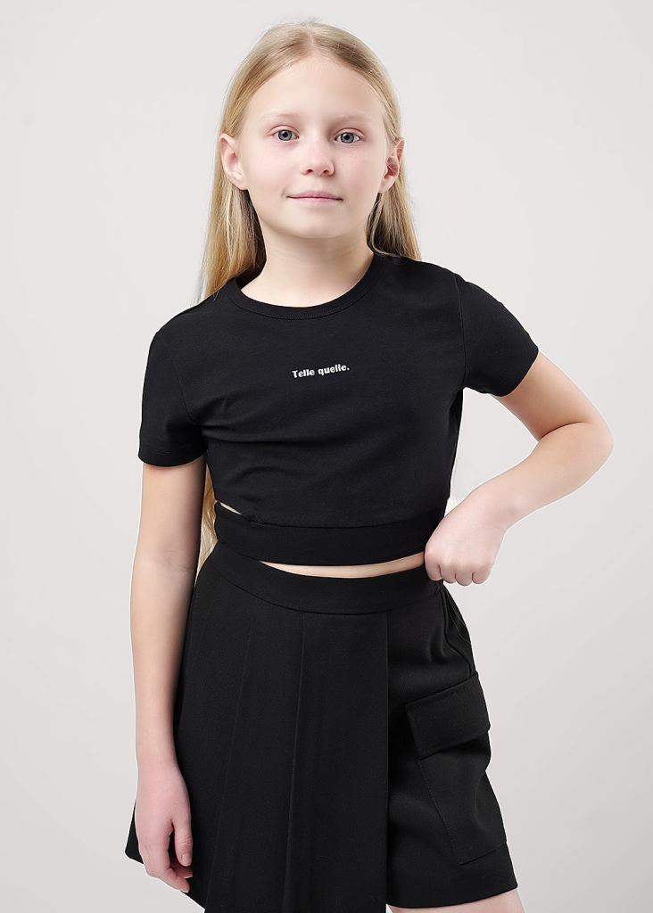 Стильная укороченная футболка с разрезом из эластичного хлопка. Комфортная посадка, актуальная моделЬ, которую легко сочетать с любимыми джоггерами или юбкой в складку. Небольшой декор голографичной плёнкой добавит яркий акцент.