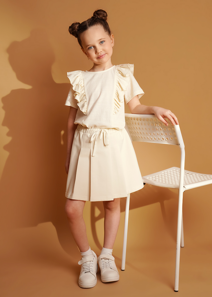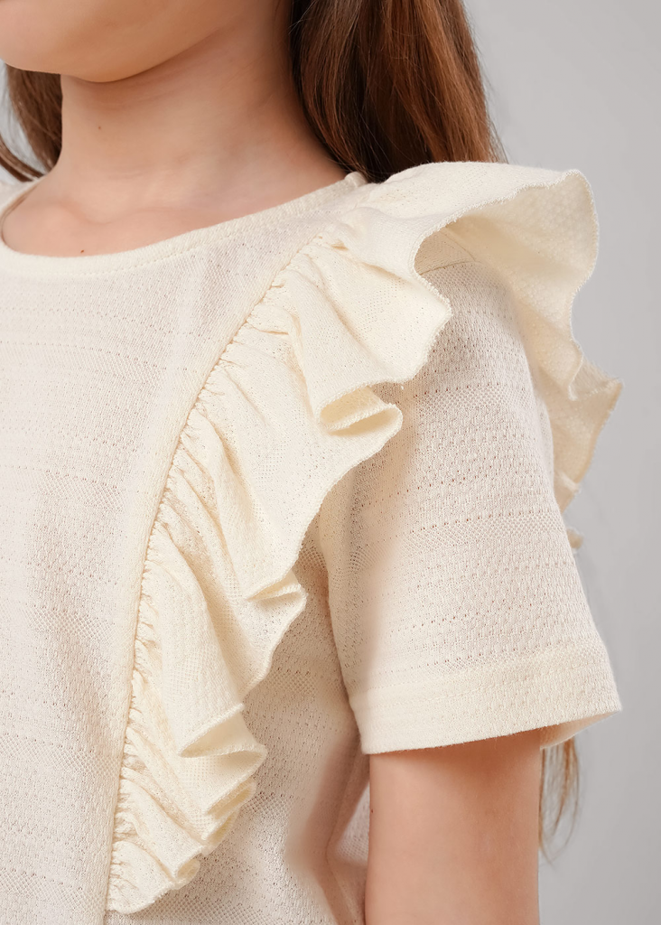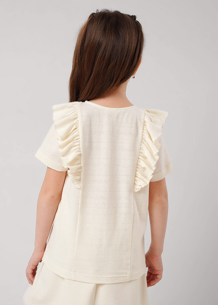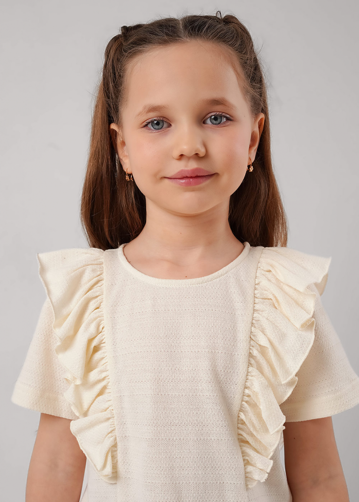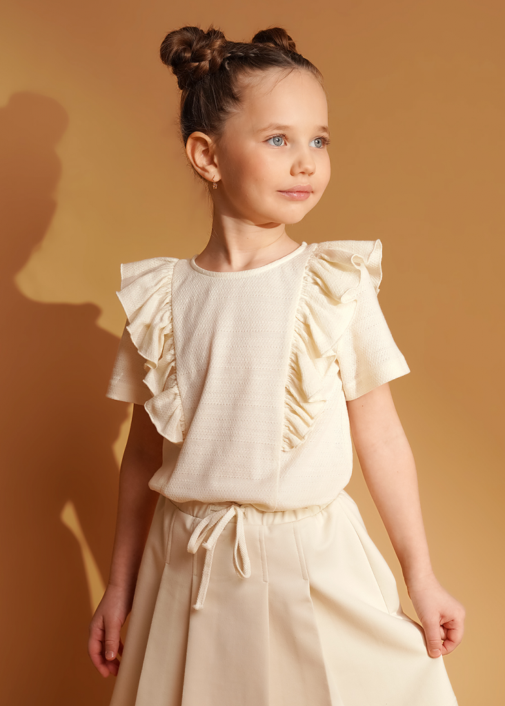 Футболка из ажурного полотна, украшенная сборкой и вышивкой. Круглый вырез горловины оформлен эластичной окантовкой. Модель станет стильным дополнением твоего гардероба.