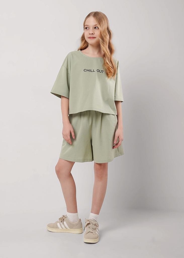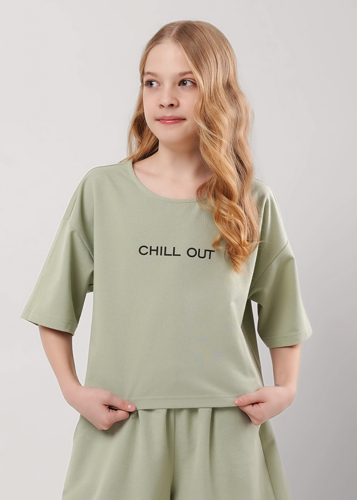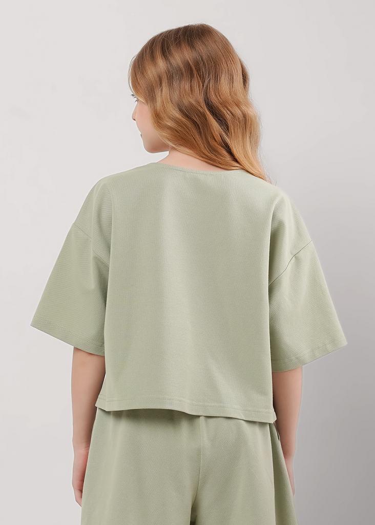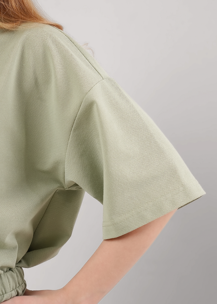 Укороченная футболка из пике для девочки круто смотрится с любым низом! Особенности модели - спущенная линия плеча, свободный крой - то, что нужно для летних образов. Сочетай футболку с шортами из новой коллекции.