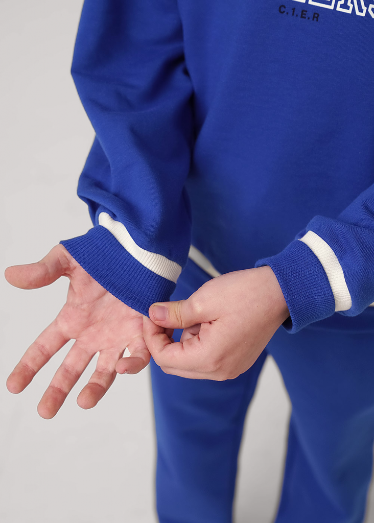 Стильный базовый свитшот в ярком синем оттенке- отличное дополнение к твоему гардеробу! Контрастная отделка по горловине, манжетам и низу модели. Свитшот дополнен оригинальным дизайнерским принтом! Создавай классные луки на каждый день и будь в тренде!