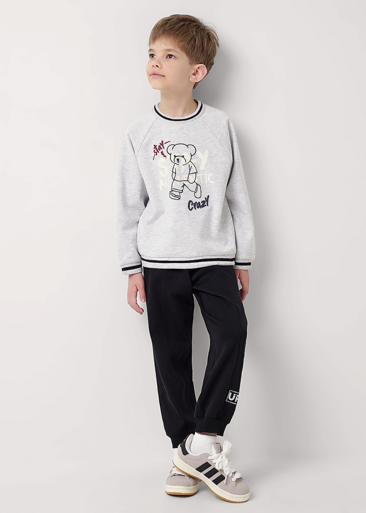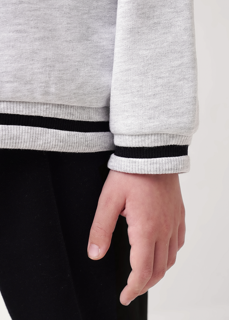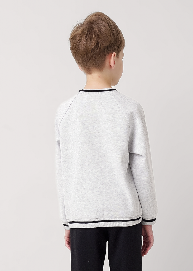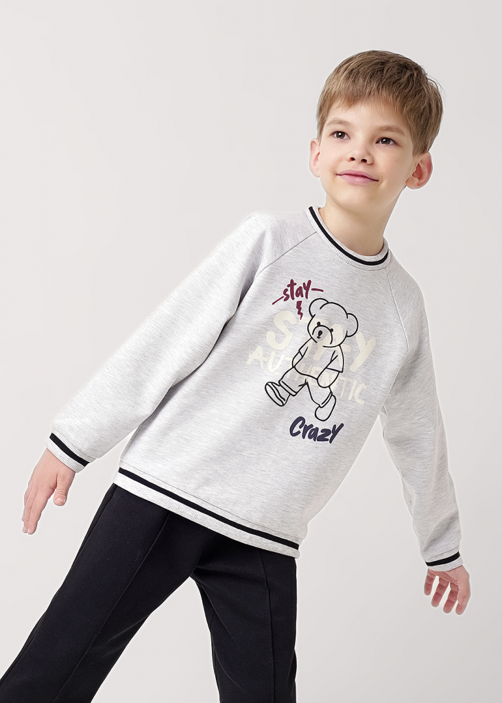 Стильный меланжевый джемпер- тренд сезона! Модель расслабленного кроя с рукавом "реглан" деально дополнит твой гардероб. Модель дополнена эластичной горловиной, манжетами и поясом с контрастными полосками. Стильный принт спереди завершает образ.