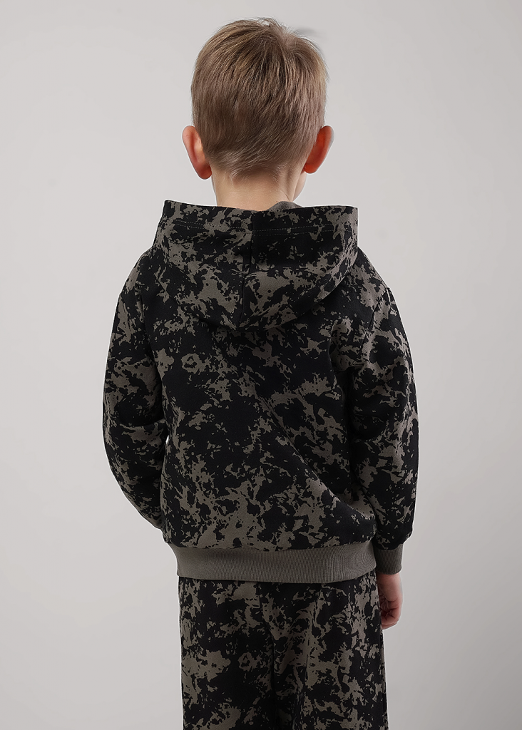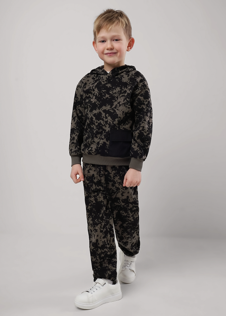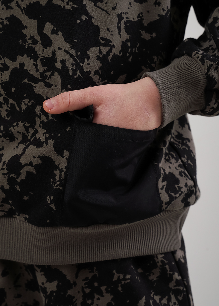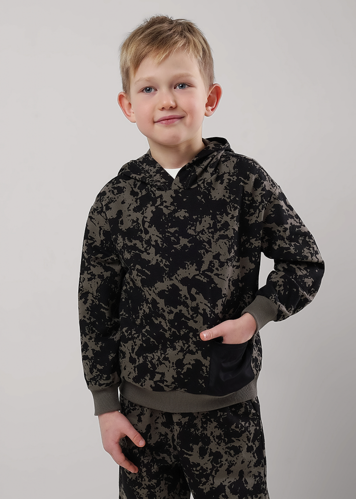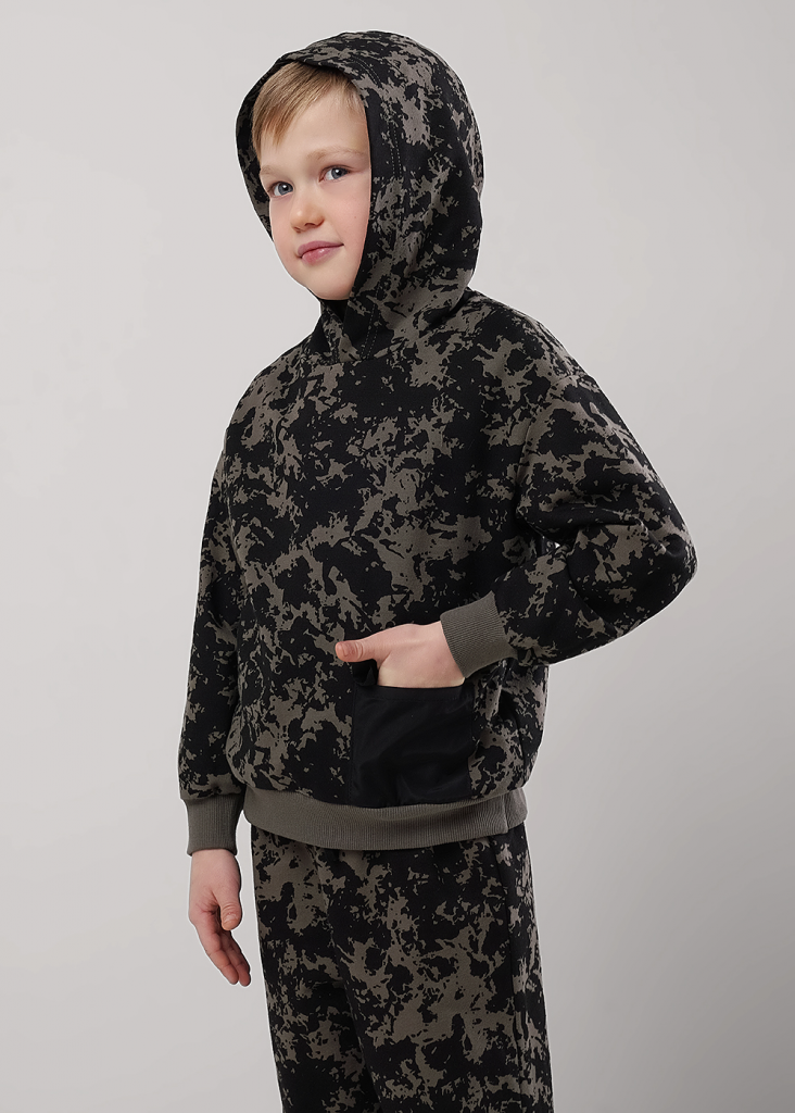 Набивная худи из хлопкового футера для активной жизни ребёнка. Комфортная посадка, манжеты и пояс из кашкорсе. Стильный элемент - накладной карман из плащёвки. Сочетай с любимыми джоггерами и будь в тренде.