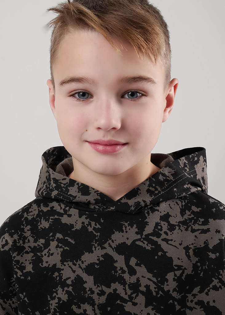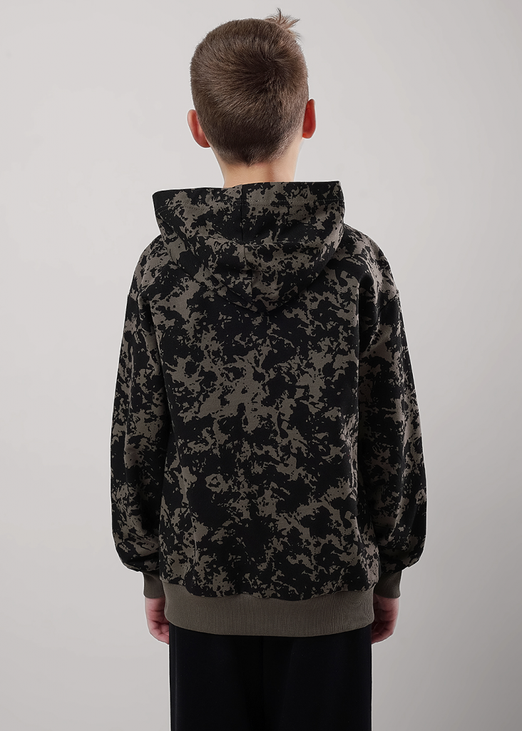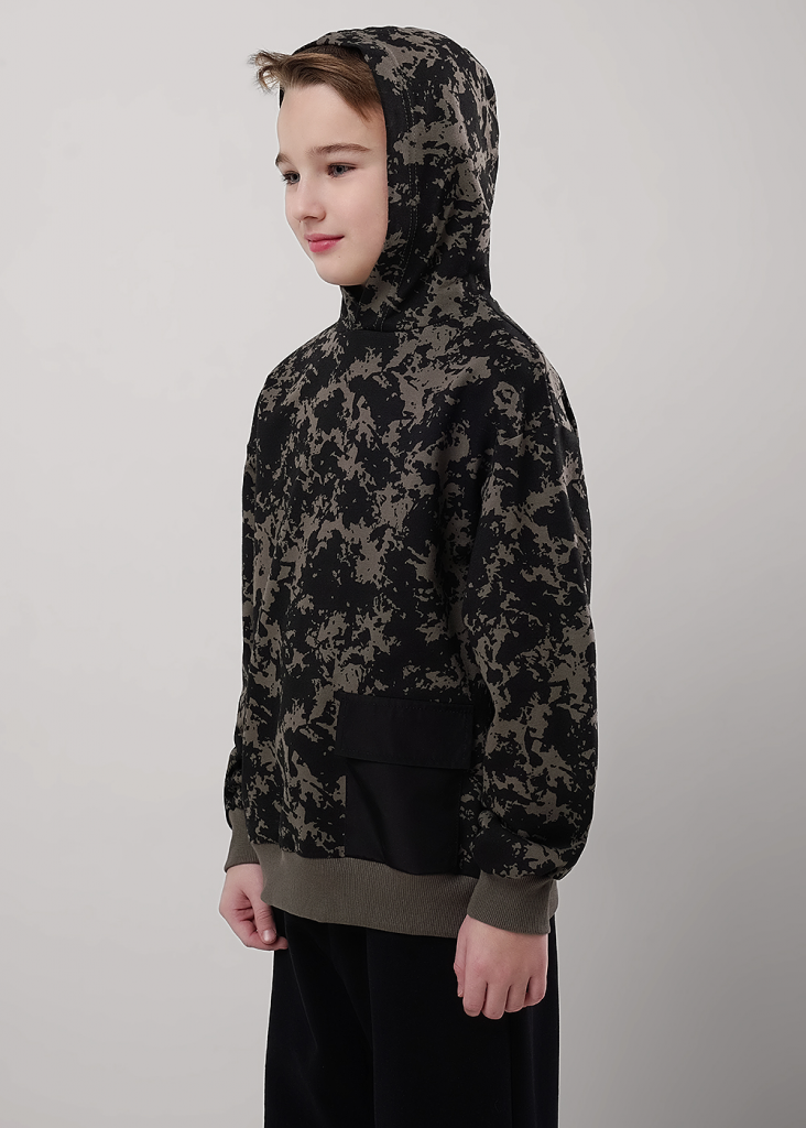 Набивная худи из хлопкового футера для активной жизни ребёнка. Комфортная посадка, манжеты и пояс из кашкорсе. Стильный элемент - накладной карман из плащёвки. Сочетай с любимыми джоггерами и будь в тренде.