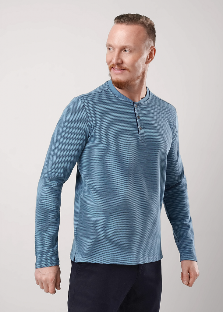 Джемпер из трикотажного фактурного полотна "ячейка". Изделие с удобной планкой на пуговицы и дополнено дизайнерским принтом. Данная модель отличное дополнение к брюкам или джинсам. Прекрасно подойдёт для встречи с друзьями.