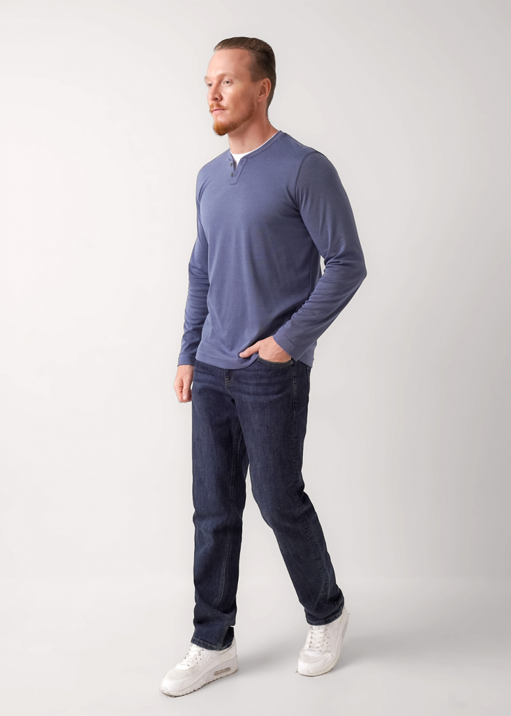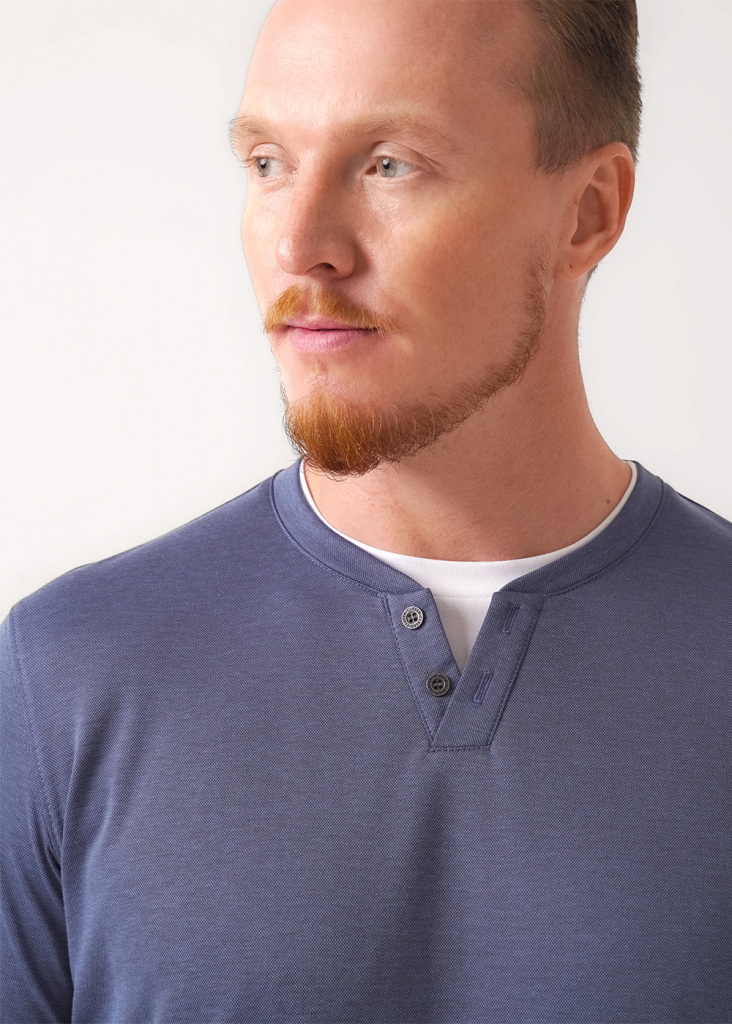 Лонгслив из трикотажного полотна "пике" с имитацией двойной горловины и удобной планкой на пуговицы. Данное изделие отличное дополнение к брюкам или джинсам. Прекрасно подойдёт для встречи с друзьями или похода на работу.