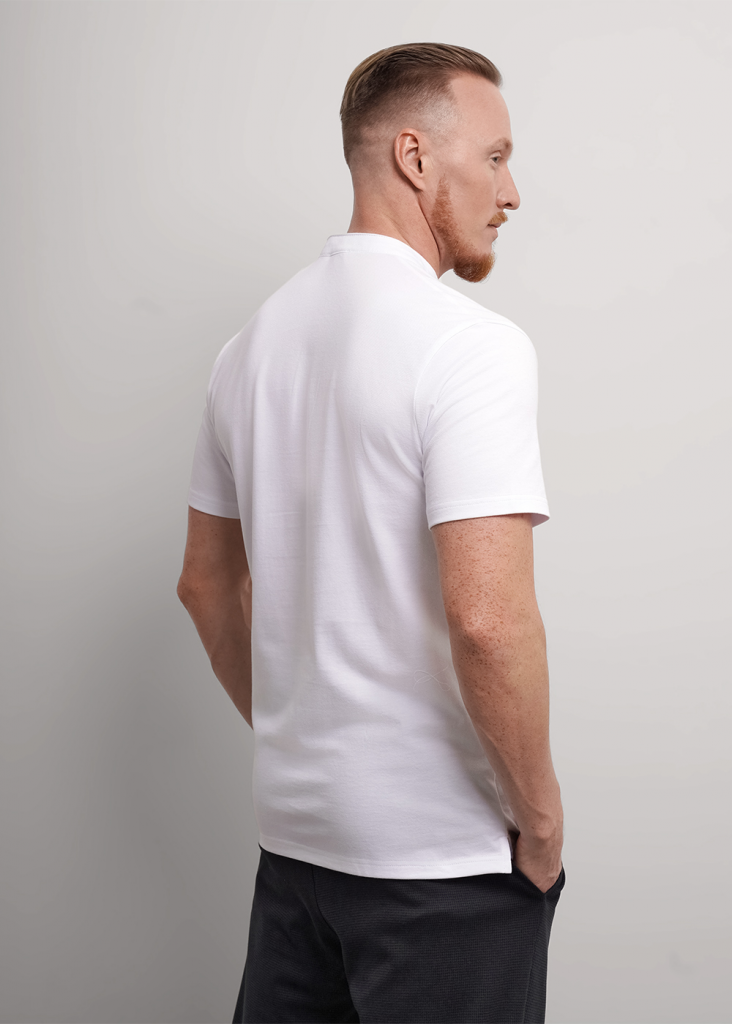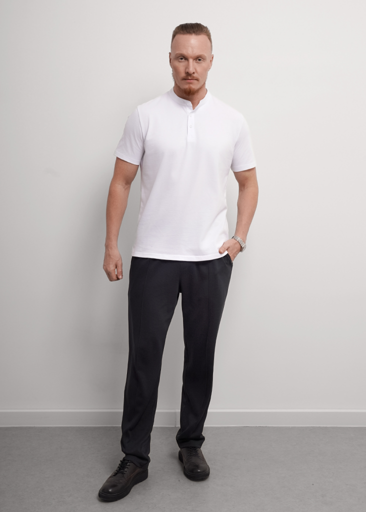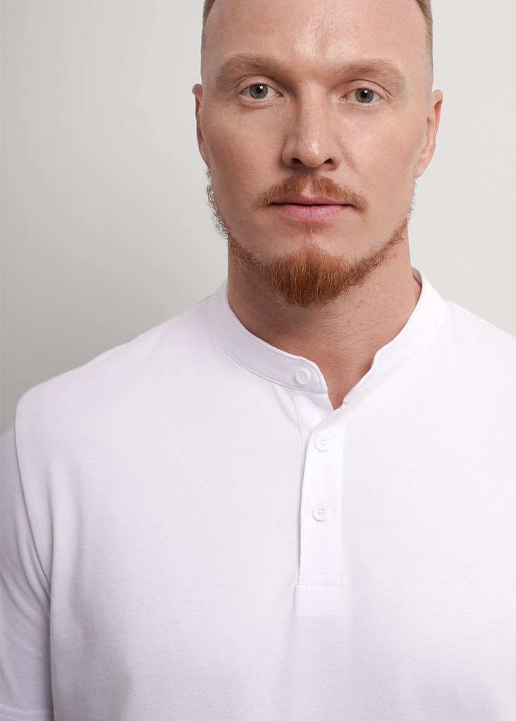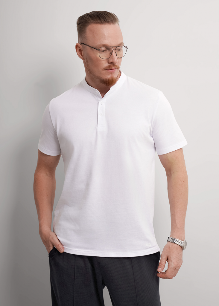 Футболка-поло с воротником-стойка и функциональной планкой на пуговицах, из хлопкового трикотажного полотна пике. Составит отличный комплект с брюками для школы и офиса.