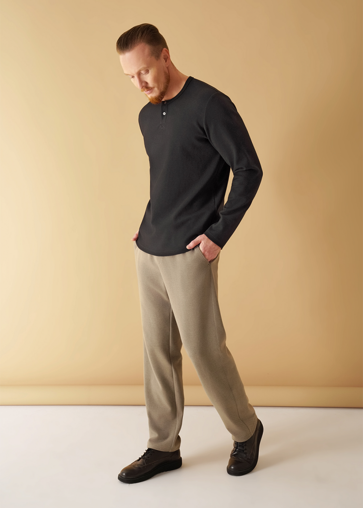 Лонгслив мужской с длинным рукавом, округлой горловиной и планкой, выполнен из фактурного трикотажного "вафля". Модель дополнена имиджевой фурнитурой. Прекрасно подойдёт для любого низа благодаря своей универсальности.