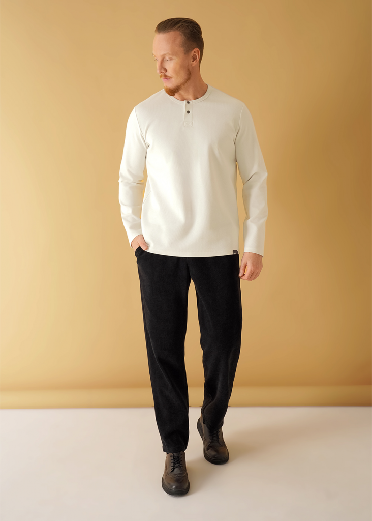 Лонгслив мужской с длинным рукавом, округлой горловиной и планкой, выполнен из фактурного трикотажного "вафля". Модель дополнена имиджевой фурнитурой. Прекрасно подойдёт для любого низа благодаря своей универсальности.