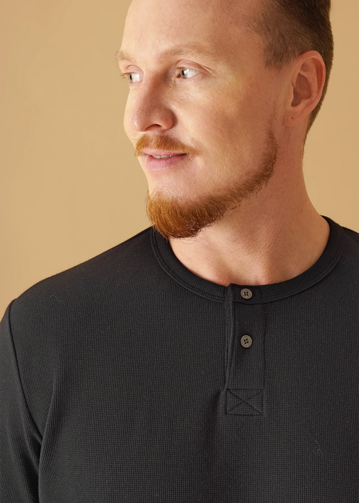 Лонгслив мужской с длинным рукавом, округлой горловиной и планкой, выполнен из фактурного трикотажного "вафля". Модель дополнена имиджевой фурнитурой. Прекрасно подойдёт для любого низа благодаря своей универсальности.