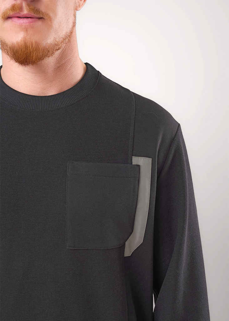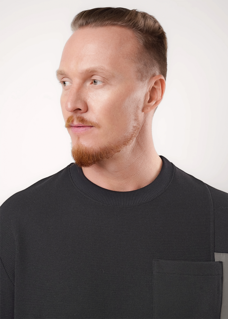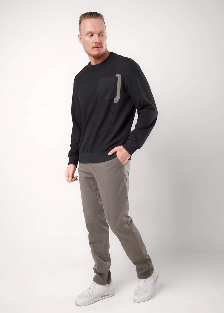 Стильный мужской комбинированный джемпер из трикотажного фактурного полотна. Изделие с круглым вырезом горловины и длинным рукавом на манжете. Модель дополняется нагрудным карманом. Отличный вариант на каждый день и встреч с друзьями.