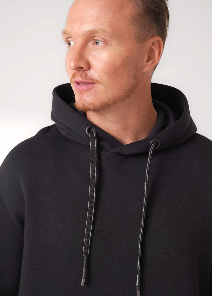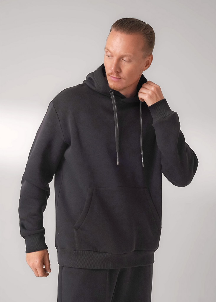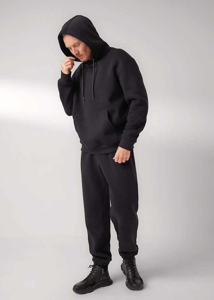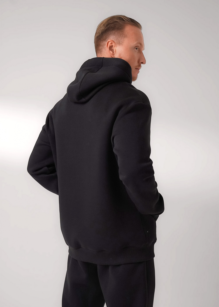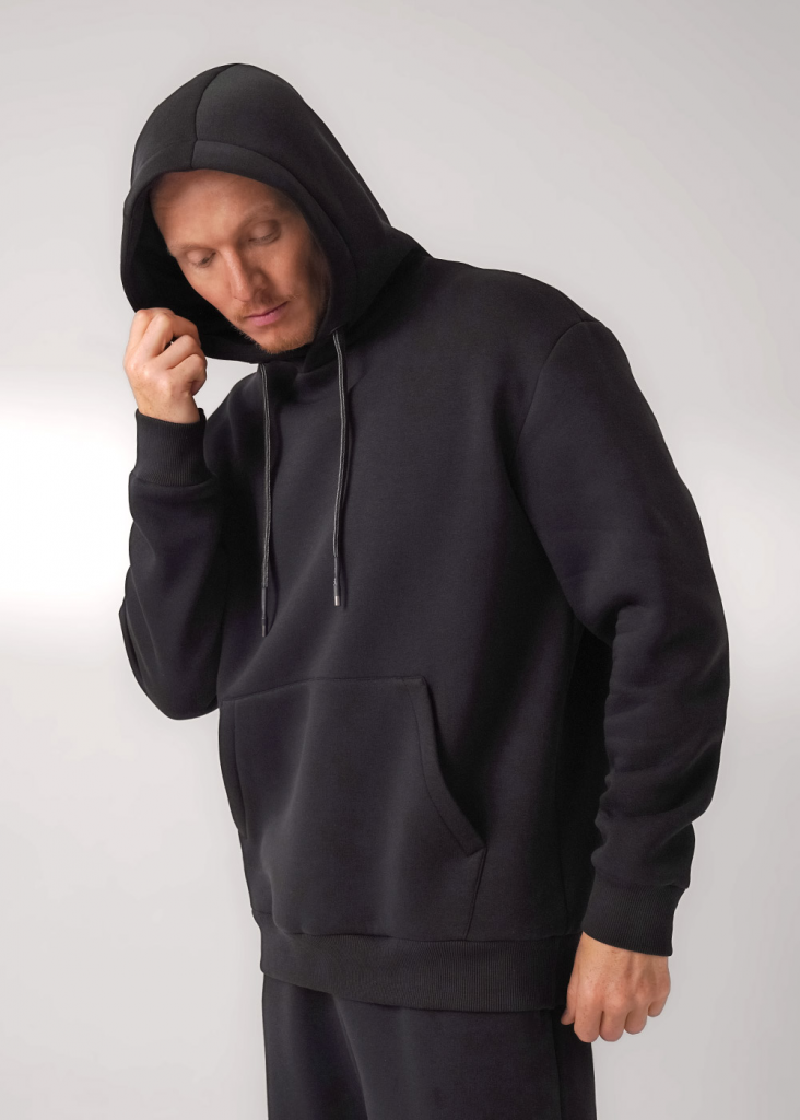 Теплое мужское худи из футера с начесом на капюшоне с регулируемым шнуром, удобным спущенным рукавом и центральным карманом "кенгуру". Изделие дополнено имиджевым принтом. Модель составит отличный комплект с брюками.