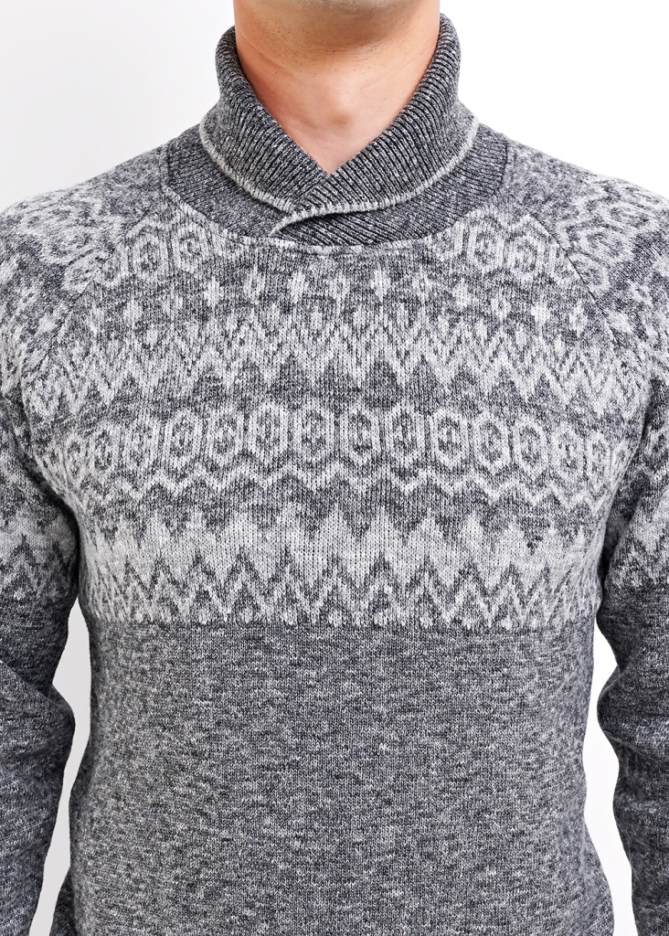 Мужской вязаный джемпер из смесовой пряжи с эстетичным узором на уровне плеч. Благодаря шалевому воротнику модель будет удерживать тепло, а комбинация с рубашкой и брюками сделает деловой образ более лаконичным и завершенным.