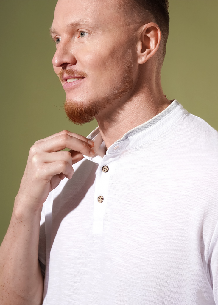 Футболка-поло из дышащего хлопкового полотна флам-пике с вязаными деталями и воротником-стойка, с функциональной планкой на пуговицах. Изделие дополнено боковыми разрезами. Отличный вариант на каждый день.