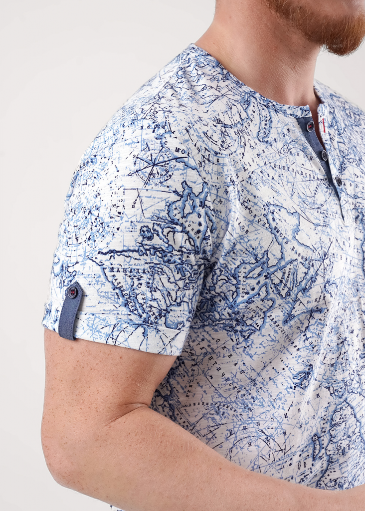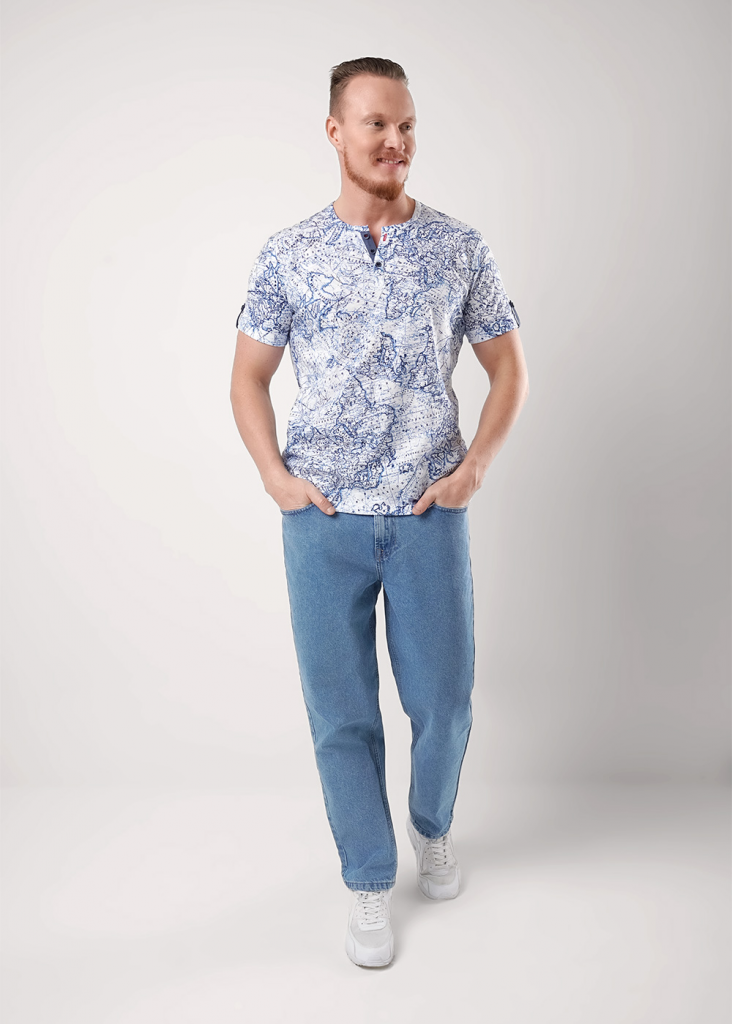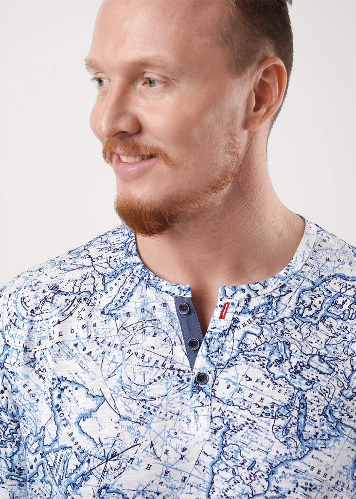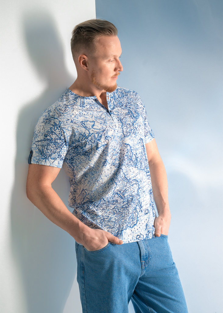 Мужская футболка из хлопкового трикотажного полотна "флам" с круглой горловиной и планкой на пуговицах, с коротким втачным рукавом. Модель дополнена имиджевой фурнитурой.