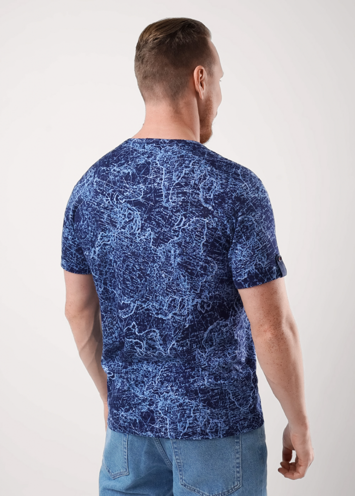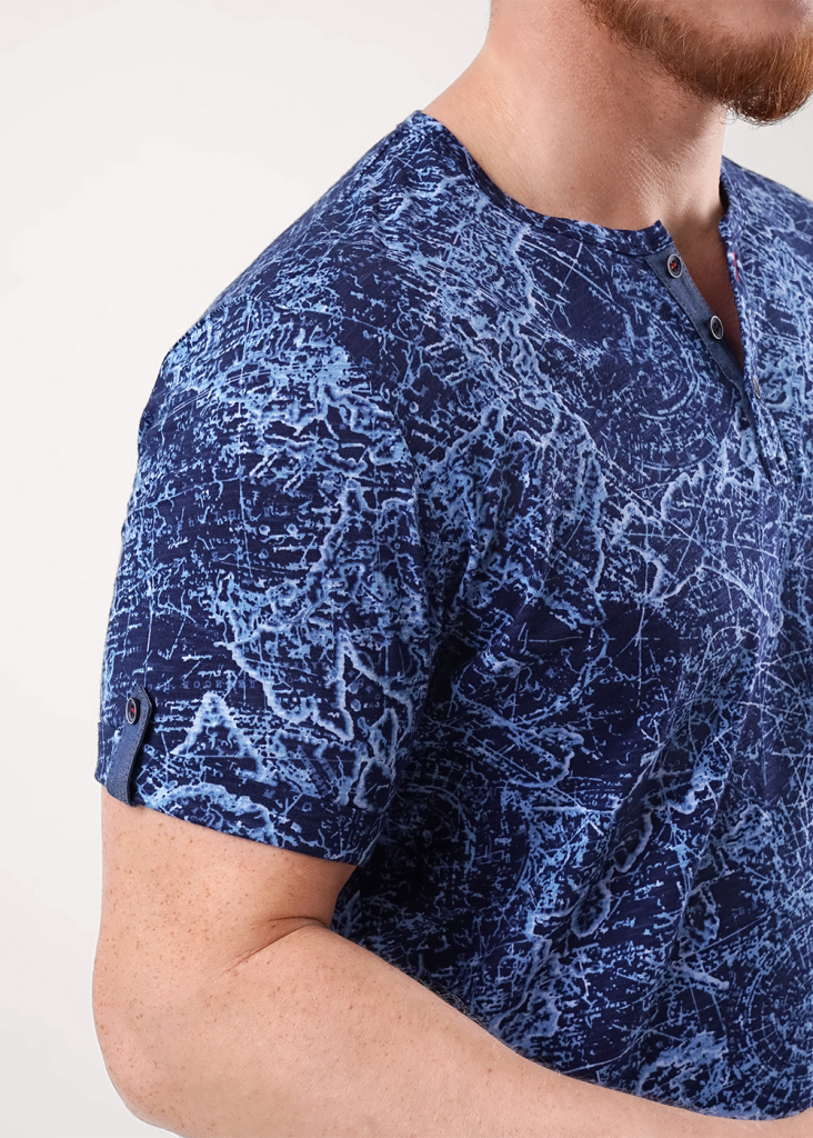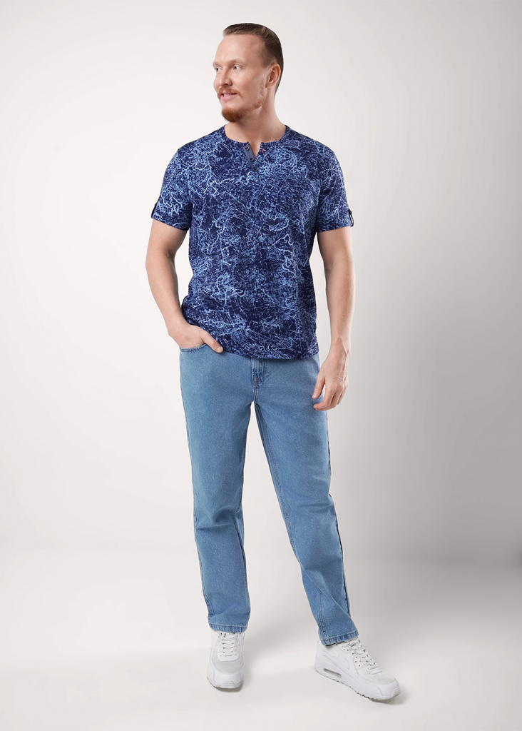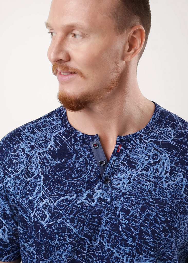Мужская футболка из хлопкового трикотажного полотна "флам" с круглой горловиной и планкой на пуговицах, с коротким втачным рукавом. Модель дополнена имиджевой фурнитурой.
