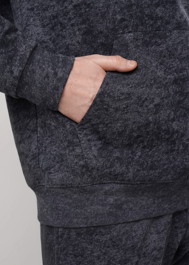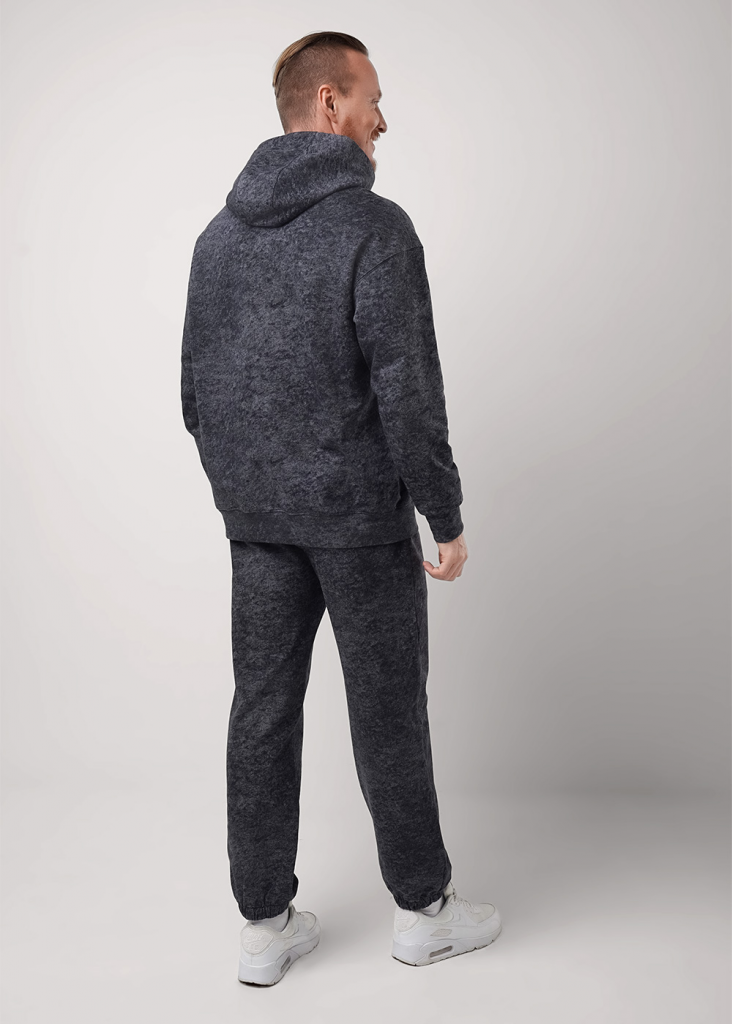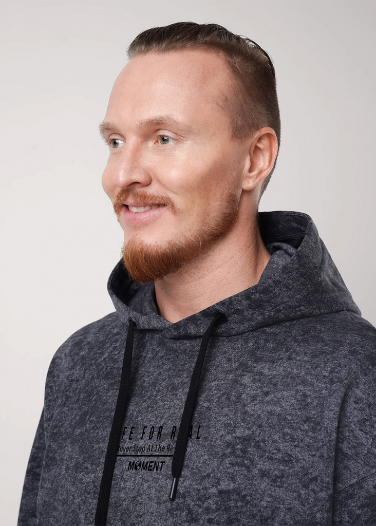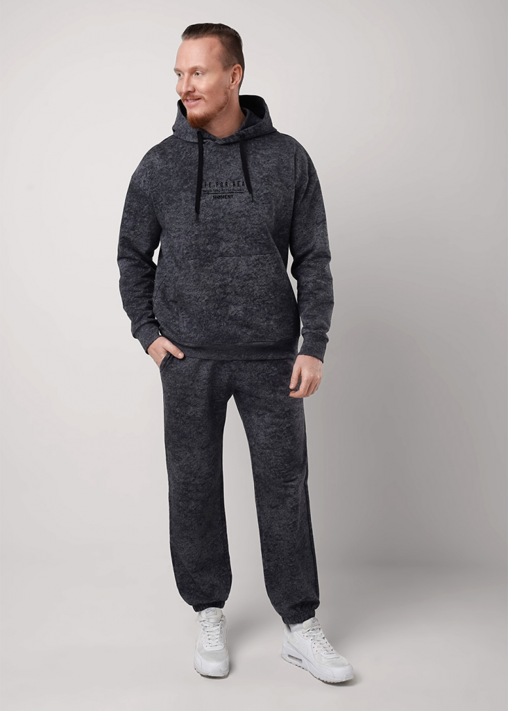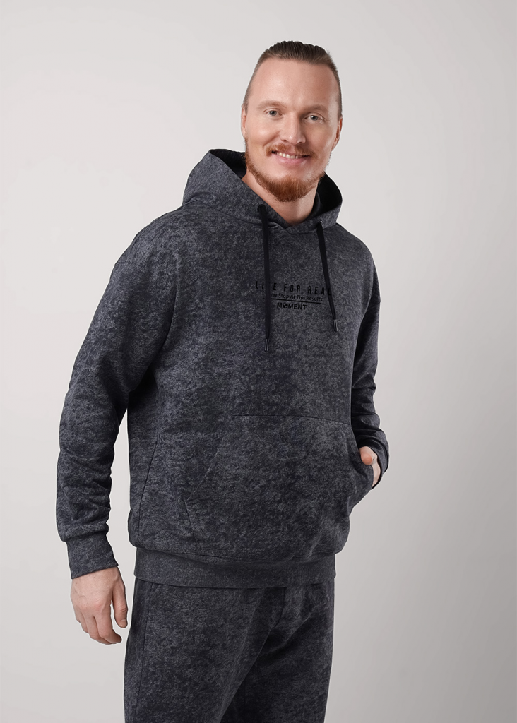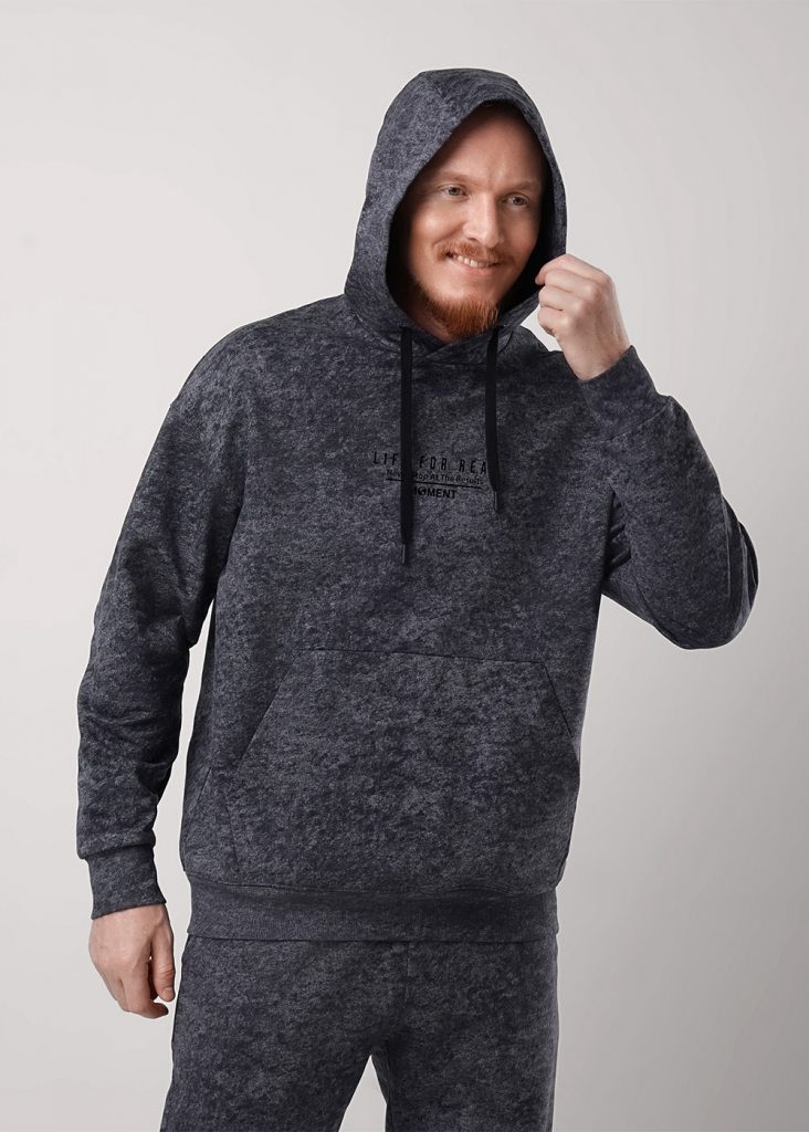 Мужская толстовка увеличенного объёма с капюшоном. Модель выполнена из трикотажного набивного полотна с эффектом варенки. Модель дополнена карманом кенгуру и дизайнерским принтом. Стильное решение для повседневного образа.